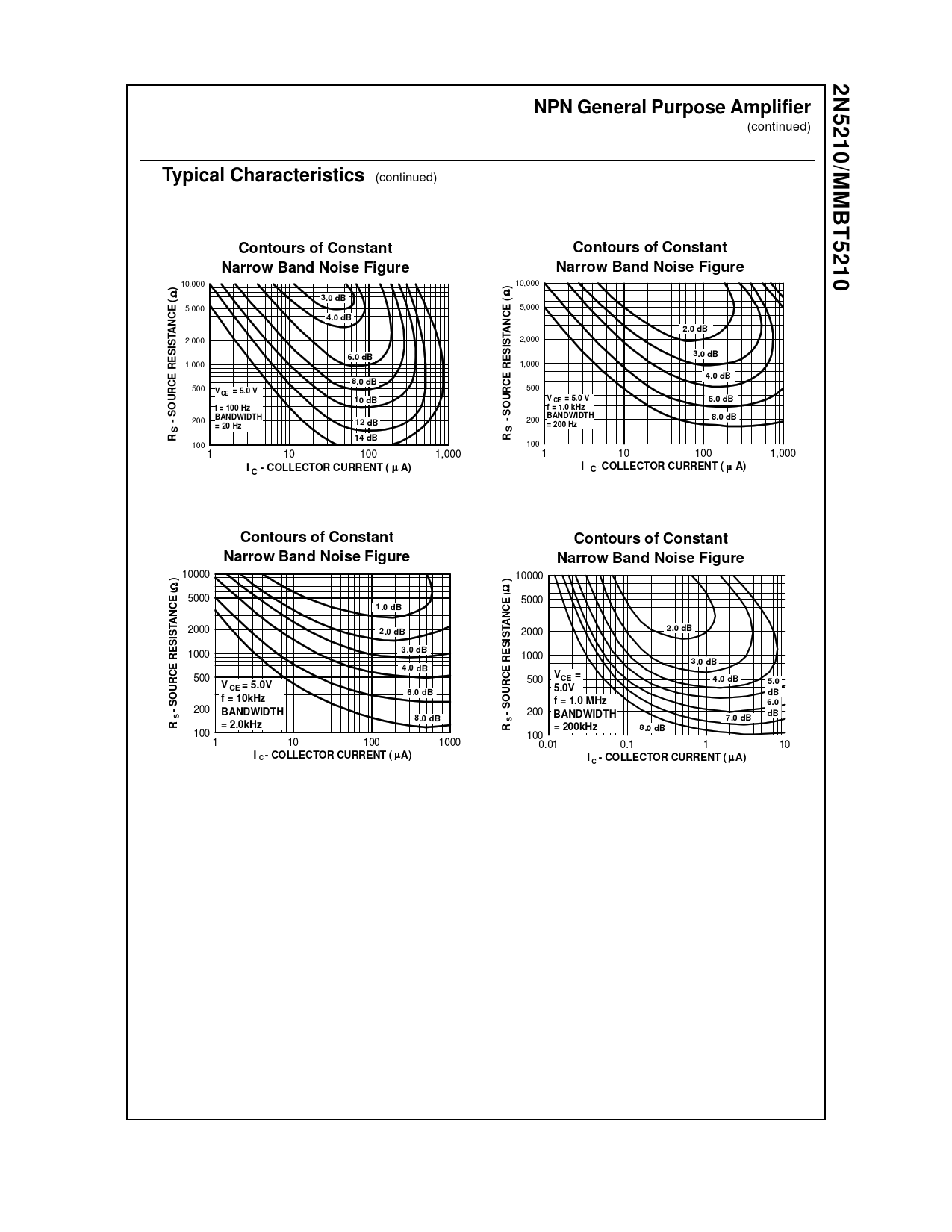 (continued) Typical Characteristics (continued) Contours of Constant Narrow Band Noise Figure 10,000 R S -SOURCE RESISTANCE ( Ω ) R S -SOURCE RESISTANCE ( Ω ) Contours of Constant Narrow Band Noise Figure 3.0 dB 5,000 4.0 dB 2,000 6.0 dB 1,000 8.0 dB 500 V CE = 5.0 V 200 f = 100 Hz BANDWIDTH = 20 Hz 10 dB 12 dB 14 dB 100 1 10,000 5,000 2.0 dB 2,000 3.0 dB 1,000 4.0 dB 500 V CE = 5.0 V f = 1.0 kHz BANDWIDTH = 200 Hz 200 1 1,000 10000 1.0 dB 2.0 dB 3.0 dB 1000 4.0 dB 500 V CE = 5.0V f = 10kHz BANDWIDTH = 2.0kHz 200 100 1 6.0 dB 10 100 I C -COLLECTOR CURRENT ( µ A) 10 100 I C-COLLECTOR CURRENT ( µ A) 1,000 Contours of Constant Narrow Band Noise Figure 8.0 dB 1000 R S -SOURCE RESISTANCE (Ω ) R S -SOURCE RESISTANCE (Ω ) Contours of Constant Narrow Band Noise Figure 2000 8.0 dB 100 10 100 I C -COLLECTOR CURRENT ( µ A) 5000 6.0 dB 10000 5000 2000 1000 2.0 dB 3.0 dB VCE = 4.0 dB 5.0V f = 1.0 MHz 200 BANDWIDTH 7.0 dB = 200kHz 8.0 dB 100 0.01 0.1 1 I C -COLLECTOR CURRENT ( µ A) 500 5.0 dB 6.0 dB 10 2N5210/MMBT5210 NPN General Purpose Amplifier