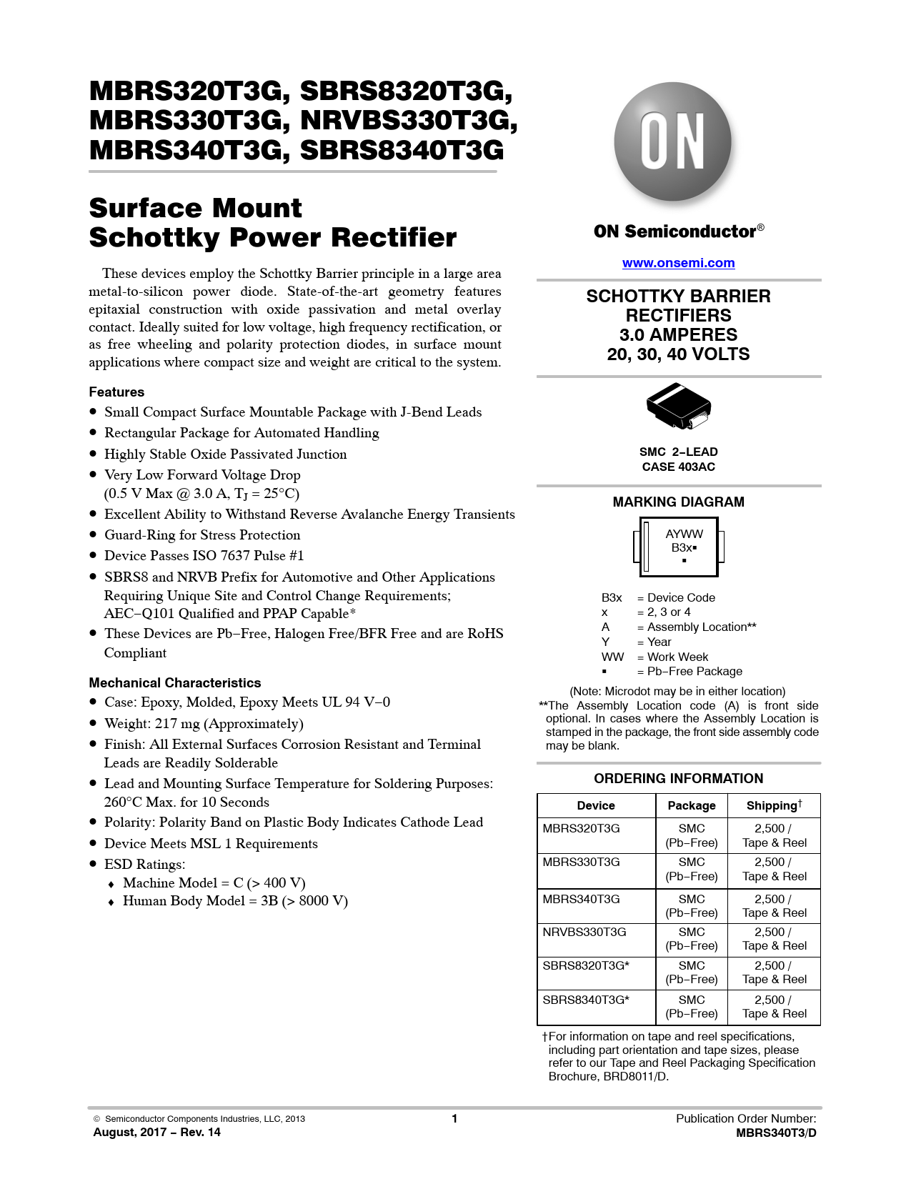 August, 2017 − Rev. 14 MBRS340T3/D