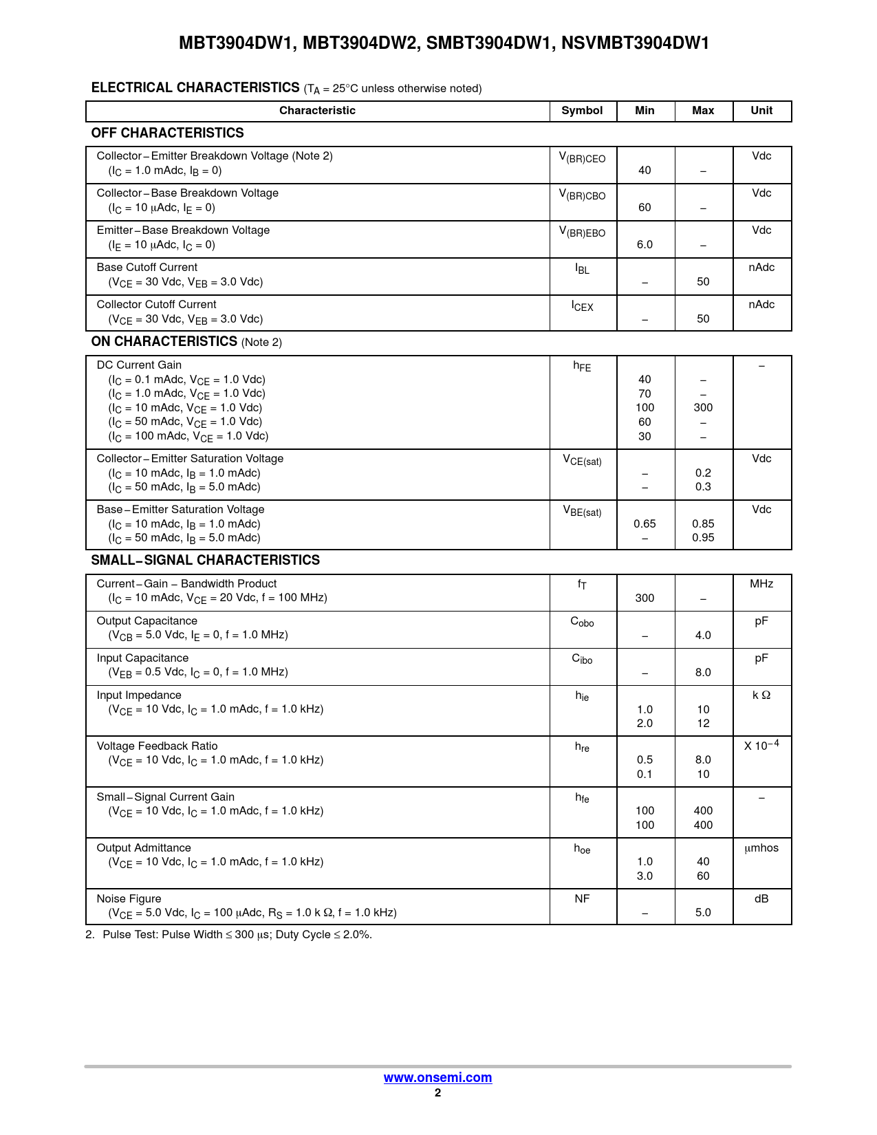 MBT3904DW1, MBT3904DW2, SMBT3904DW1, NSVMBT3904DW1. ELECTRICAL CHARACTERISTICS. Characteristic. Symbol. Min. Max. Unit