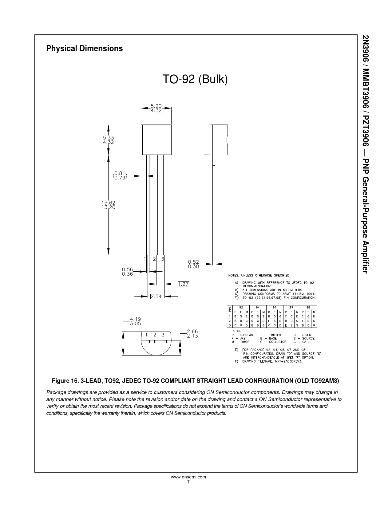 2 N 3906 / MMBT3906 / PZTPhysical Dimensions TO-92 (Bulk) 3906 —P N P General-PurposeAmplifier D Figure 16. 3-LEAD, TO92, JEDEC TO-92 COMPLIANT STRAIGHT LEAD CONFIGURATION (OLD TO92AM3) Package drawings are provided as a service to customers considering ON Semiconductor components. Drawings may change in any manner without notice. Please note the revision and/or date on the drawing and contact a ON Semiconductor representative to verify or obtain the most recent revision. Package specifications do not expand the terms of ON Semiconductor’s worldwide terms and conditions, specifically the warranty therein, which covers ON Semiconductor products. www.onsemi.com 7 www.onsemi.com 2 www.onsemi.com 2