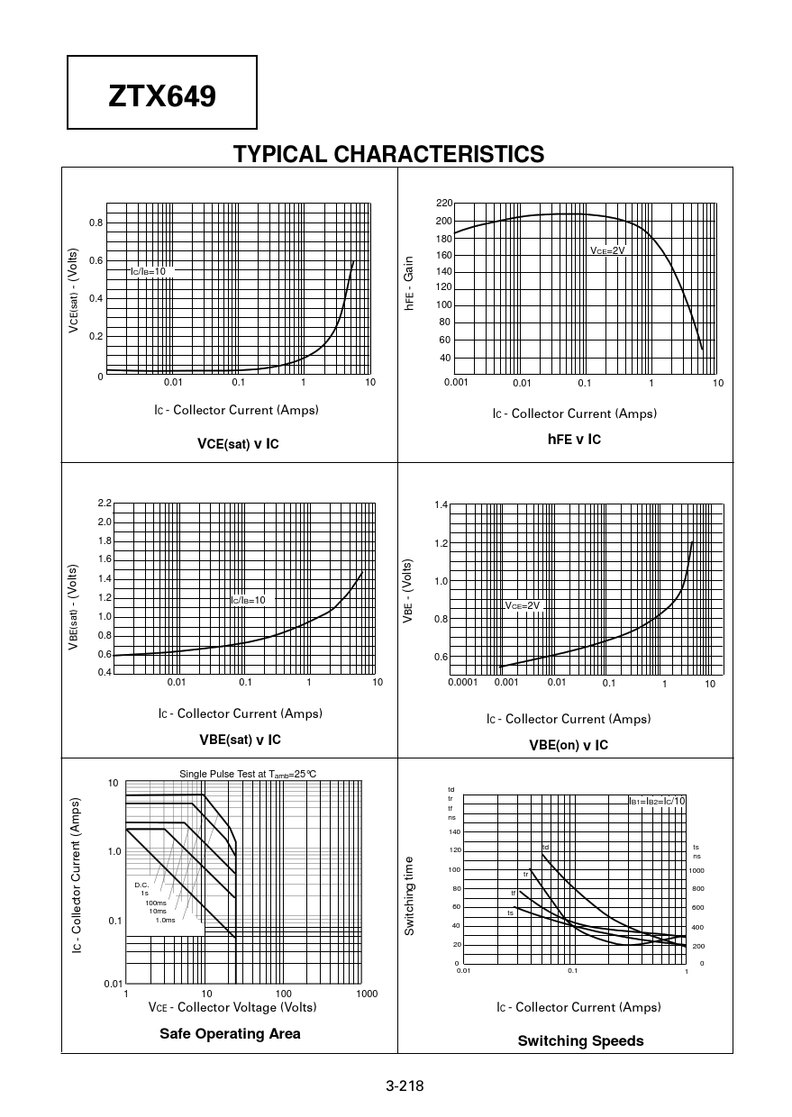 ZTX649 TYPICAL CHARACTERISTICS 220 0.8 200 180 V 160 CE=2V 0.6 olts) IC/IB=10 140 - (V - Gain 120 ) t 0.4 FE sa( h 100 CE 80 V 0.2 60 40 0 0.01 0.1 1 10 0.001 0.01 0.1 1 10 IC - Collector Current (Amps) IC - Collector Current (Amps) VCE(sat) v IChFE v IC 2.2 1.4 2.0 1.8 1.2 1.6 olts) olts) 1.4 V 1.0 (- - (V 1.2 IC/IB=10 ) E VCE=2V t B a 1.0 0.8 (s V E B 0.8 V 0.6 0.6 0.4 0.01 0.1 1 10 0.0001 0.001 0.01 0.1 1 10 IC - Collector Current (Amps) IC - Collector Current (Amps) VBE(sat) v ICVBE(on) v IC Single Pulse Test at Tamb=25°C 10 td tr IB1=IB2=IC/10 ps) tf ns Am 140 t ( n td ts e 1.0 120 r e ns mi 100 1000 tr Cur t r D.C. 80 800 to 1s tf c 100ms le 60 600 l 10ms itching ts 0.1 1.0ms w 40 400 - Co S C I 20 200 0 0 0.01 0.1 1 0.01 1 10 100 1000 VCE - Collector Voltage (Volts) IC - Collector Current (Amps) Safe Operating AreaSwitching Speeds 3-218