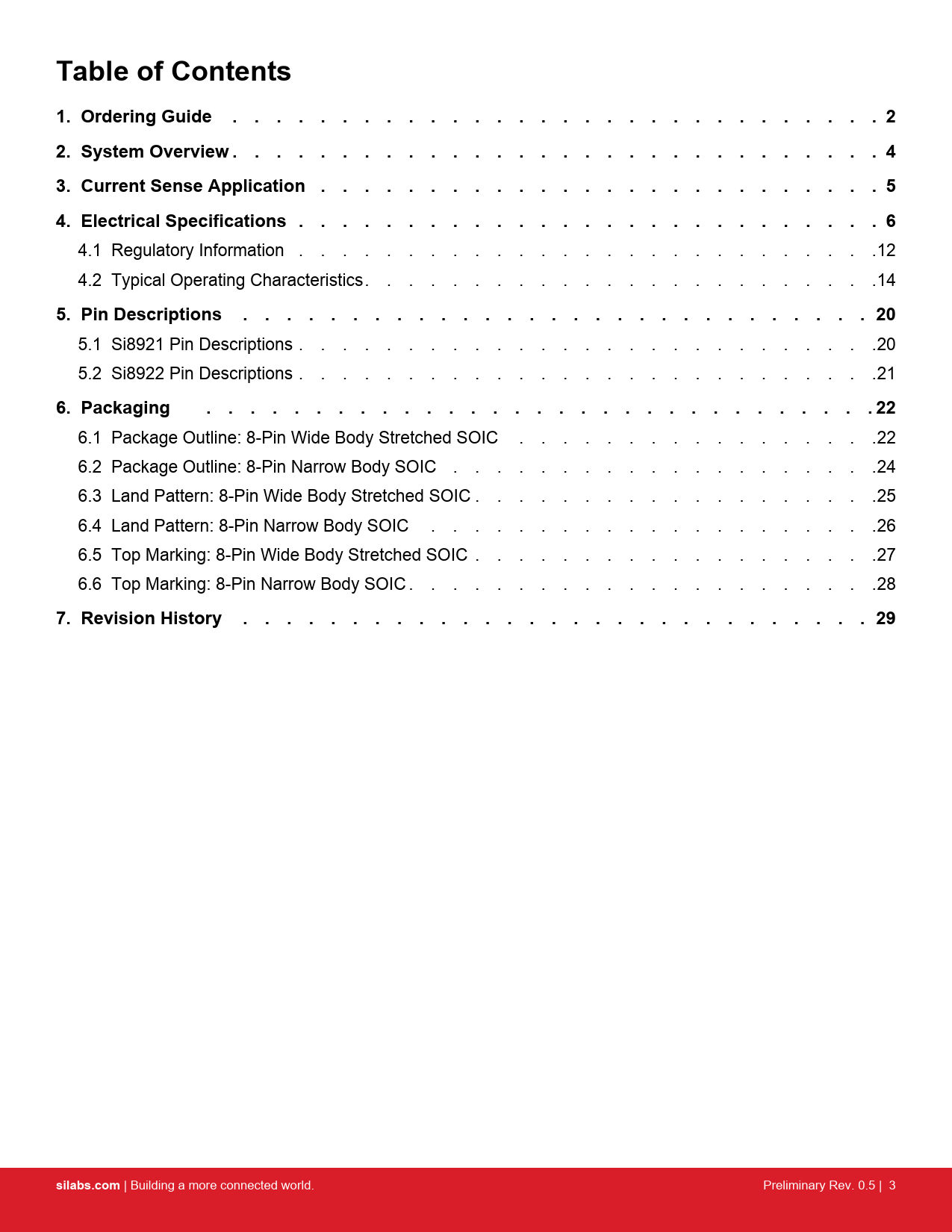 link to page 2 link to page 2 link to page 4 link to page 4 link to page 5 link to page 5 link to page 6 link to page 6 link to page 12 link to page 12 link to page 14 link to page 14 link to page 20 link to page 20 link to page 20 link to page 20 link to page 21 link to page 21 link to page 22 link to page 22 link to page 22 link to page 22 link to page 24 link to page 24 link to page 25 link to page 25 link to page 26 link to page 26 link to page 27 link to page 27 link to page 28 link to page 28 link to page 29 link to page 29 Table of Contents1. Ordering Guide. 22. System Overview. 43. Current Sense Application. 54. Electrical Specifications. 6 4.1 Regulatory Information . .12 4.2 Typical Operating Characteristics. .14 5. Pin Descriptions. 20 5.1 Si8921 Pin Descriptions . .20 5.2 Si8922 Pin Descriptions . .21 6. Packaging. 22 6.1 Package Outline: 8-Pin Wide Body Stretched SOIC . .22 6.2 Package Outline: 8-Pin Narrow Body SOIC . .24 6.3 Land Pattern: 8-Pin Wide Body Stretched SOIC . .25 6.4 Land Pattern: 8-Pin Narrow Body SOIC . .26 6.5 Top Marking: 8-Pin Wide Body Stretched SOIC . .27 6.6 Top Marking: 8-Pin Narrow Body SOIC . .28 7. Revision History. 29silabs.com | Building a more connected world. Preliminary Rev. 0.5 | 3 Document Outline 1. Ordering Guide 2. System Overview 3. Current Sense Application 4. Electrical Specifications 4.1 Regulatory Information 4.2 Typical Operating Characteristics 5. Pin Descriptions 5.1 Si8921 Pin Descriptions 5.2 Si8922 Pin Descriptions 6. Packaging 6.1 Package Outline: 8-Pin Wide Body Stretched SOIC 6.2 Package Outline: 8-Pin Narrow Body SOIC 6.3 Land Pattern: 8-Pin Wide Body Stretched SOIC 6.4 Land Pattern: 8-Pin Narrow Body SOIC 6.5 Top Marking: 8-Pin Wide Body Stretched SOIC 6.6 Top Marking: 8-Pin Narrow Body SOIC 7. Revision History
