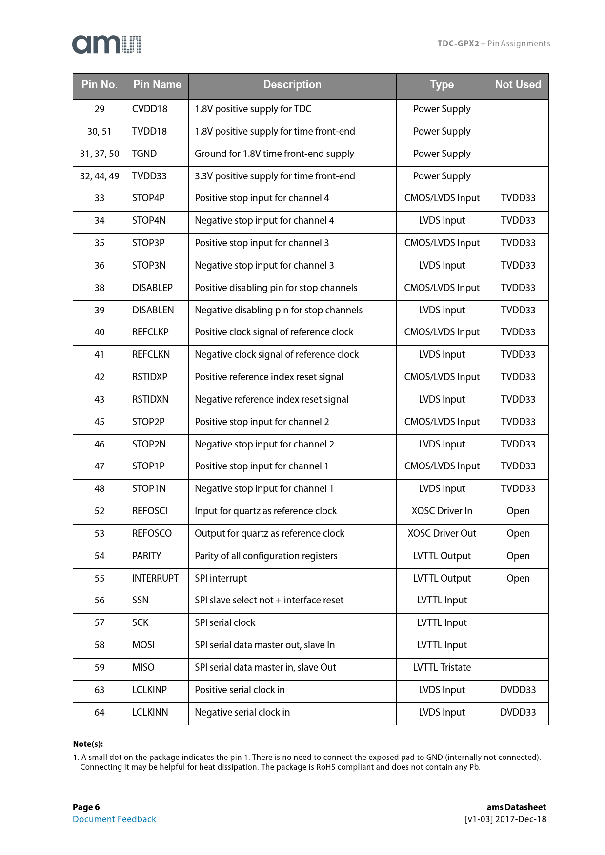 TDC-GPX2 − Pin No Pin Name Description Type Not Used Note(s): Page 6 ams Datasheet