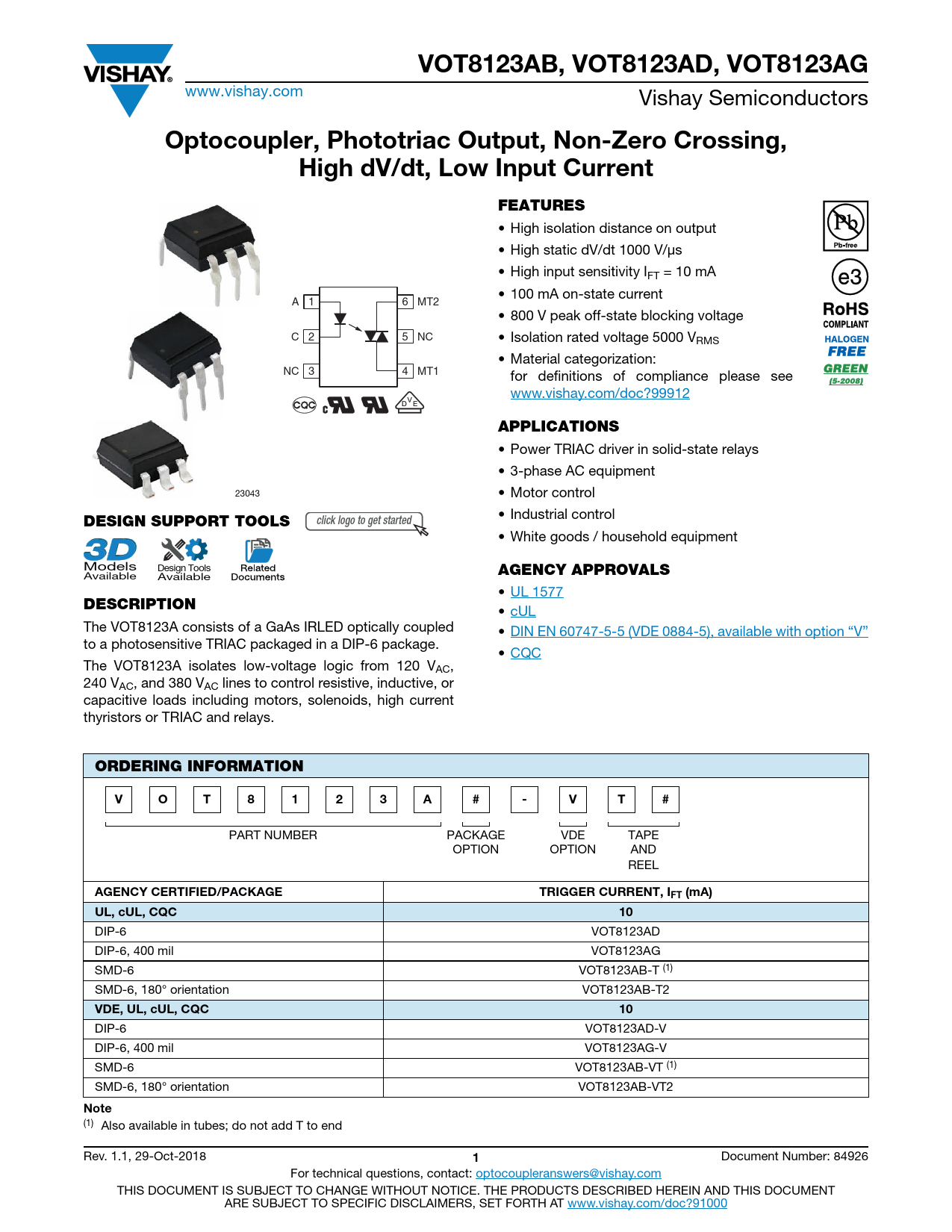 VOT8123AB, VOT8123AD, VOT8123AG www.vishay.com Vishay Semiconductors Optocoupler, Phototriac Output, Non-Zero Crossing,High dV/dt, Low Input CurrentFEATURES • High isolation distance on output • High static dV/dt 1000 V/μs • High input sensitivity IFT = 10 mA • 100 mA on-state current A 1 6 MT2 • 800 V peak off-state blocking voltage C 2 5 NC • Isolation rated voltage 5000 VRMS • Material categorization: NC 3 4 MT1 for definitions of compliance please see www.vishay.com/doc?99912 APPLICATIONS • Power TRIAC driver in solid-state relays • 3-phase AC equipment 23043 • Motor control DESIGN SUPPORT TOOLS • Industrial control click logo to get started • White goods / household equipment Models Design Tools Available Available AGENCY APPROVALS • UL 1577 DESCRIPTION • cUL The VOT8123A consists of a GaAs IRLED optically coupled • DIN EN 60747-5-5 (VDE 0884-5), available with option “V” to a photosensitive TRIAC packaged in a DIP-6 package. • CQC The VOT8123A isolates low-voltage logic from 120 VAC, 240 VAC, and 380 VAC lines to control resistive, inductive, or capacitive loads including motors, solenoids, high current thyristors or TRIAC and relays. ORDERING INFORMATIONVOT8123A#-VT# PART NUMBER PACKAGE VDE TAPE OPTION OPTION AND REEL AGENCY CERTIFIED/PACKAGETRIGGER CURRENT, IFT (mA)UL, cUL, CQC10 DIP-6 VOT8123AD DIP-6, 400 mil VOT8123AG SMD-6 VOT8123AB-T (1) SMD-6, 180° orientation VOT8123AB-T2 VDE, UL, cUL, CQC10 DIP-6 VOT8123AD-V DIP-6, 400 mil VOT8123AG-V SMD-6 VOT8123AB-VT (1) SMD-6, 180° orientation VOT8123AB-VT2 Note (1) Also available in tubes; do not add T to end Rev. 1.1, 29-Oct-2018 1 Document Number: 84926 For technical questions, contact: optocoupleranswers@vishay.com THIS DOCUMENT IS SUBJECT TO CHANGE WITHOUT NOTICE. THE PRODUCTS DESCRIBED HEREIN AND THIS DOCUMENT ARE SUBJECT TO SPECIFIC DISCLAIMERS, SET FORTH AT www.vishay.com/doc?91000