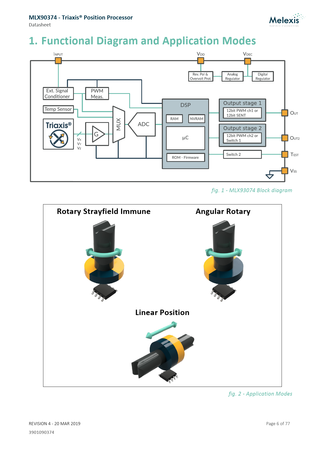 fig. 2 - Application Modes REVISION 4 - 20 MAR 2019 Page 6 of 77 3901090374 Document Outline Features and Benefits Application Examples Description Ordering Information 1. Functional Diagram and Application Modes 2. Glossary of Terms 3. Pin Definitions and Descriptions 3.1. Pin Definition for SOIC-8 package 3.2. Pin Definition for DMP 4. Absolute Maximum Ratings 5. General Electrical Specifications 6. Timing Specification 6.1. General Timing Specifications 6.2. Timing Modes 6.2.1. Continuous Asynchronous Acquisition Mode 6.2.2. Continuous Synchronous Acquisition Mode 6.3. Timing Definitions 6.3.1. Startup Time 6.3.1.1. Normal Startup 6.3.1.2. Safe Startup 6.3.1.3. Startup phase in PWM mode 6.3.2. Latency (average) 6.3.3. Step Response (worst case) 6.4. PWM timing specifications 6.5. SENT timing specifications 7. Magnetic Field Specifications 7.1. Rotary Stray-field Immune Mode (-100 code) 7.2. Linear Stray-field Immune (-200 code) 7.3. Standard/Legacy Mode (-300 code) 8. Accuracy Specifications 8.1. Definition 8.1.1. Intrinsic Linearity Error 8.1.2. Total Angle Drift 8.2. Rotary Stray-field Immune (-100 code) 8.2.1. Nominal Performance 8.2.2. Limited Performances 8.3. Linear Stray-field Immune Mode (-200 code) 8.3.1. Nominal Performances 8.3.2. Limited Performances 8.4. Standard/Legacy Mode (-300 code) 8.4.1. Nominal Performances 8.4.2. Limited Performances 9. Memory Specifications 10. Digital output protocol 10.1. PWM (pulse width modulation) 10.1.1. Definition 10.1.2. PWM performances 10.2. Single Edge Nibble Transmission (SENT) SAE J2716 10.2.1. Sensor message definition 10.2.2. Sensor message frame contents 10.2.3. Single secure sensor A.3 10.2.4. Dual Throttle position sensor A.1 10.2.5. Start-up behaviour 10.2.6. SENT Output Timing configuration 10.2.7. Serial message channel (slow channel) 10.2.8. Serial Message Error Code 10.2.9. SENT configuration shorthand definition 11. End-User Programmable Items 11.1. End User Identification Items 12. Description of End-User Programmable Items 12.1. Sensor Front-End 12.1.1. SENSING MODE 12.1.2. GAINMIN and GAINMAX Parameters 12.2. Sensor DSP Configuration 12.2.1. Discontinuity Point (or Zero Degree Point) 12.2.2. CW (Clockwise) Parameter 12.2.3. Filter 12.2.3.1. FIR Filter 12.2.3.2. Exponential Moving Average (IIR) Filter 12.2.4. WORKING_RANGE Parameter for Angle Range Selection 12.2.5. WORK_RANGE_GAIN Parameter for Angle Range Selection 12.2.6. Piecewise Linear Transform 12.2.6.1. 4-Pts LNR Parameters 12.2.6.2. 8-Pts LNR Parameters 12.2.6.3. 17-Pts LNR Parameters 12.2.6.4. 32-Pts LNR parameters 12.2.7. Scaling Parameter 12.2.8. Thermal offset correction - OUTSLOPE 12.2.9. Second Output Gain and Offset Parameters 12.2.10. CLAMPING Parameters 12.3. Selection of Output modes 12.3.1. Digital Output Protocol (PROTOCOL) 12.3.2. PWM Output Polarity and Frequency 12.3.3. PWM Redundant Output 12.3.4. Dual PWM fault Reporting Mode 12.3.5. OUT mode (ABE_OUT_MODE) 12.3.6. SENT Serial Channel Configuration - Status and Communication Nibble 12.3.7. Switch Function (Kickdown) 12.4. Programmable Diagnostics Settings 12.4.1. Diagnostics Global Enable 12.4.2. Diagnostic Debouncer 12.4.3. Over/Under Temperature Diagnostic 12.4.4. PWM Diagnostic 13. Functional Safety 13.1. Safety Manual 13.2. Safety Mechanisms 14. Recommended Application Diagrams 14.1. Wiring with the MLX90374 in SOIC-8 Package 14.2. Wiring with the MLX90374 in DMP-4 Package (built-in capacitors) 15. Standard information regarding manufacturability of Melexis products with different soldering processes 16. ESD Precautions 17. Package Information 17.1. SOIC-8 - Package Dimensions 17.2. SOIC-8 - Pinout and Marking 17.3. SOIC-8 - Sensitive spot positioning 17.3.1. Rotary Stray-field Immune and Standard Mode Applications 17.3.2. Linear Stray-field Immune Applications 17.4. SOIC-8 - Angle detection 17.5. DMP-4 - Package Outline Dimensions (POD) STD1 1.27 17.6. DMP-4 - Package Outline Dimensions (POD) STD3 2.00 17.7. DMP-4 - Marking 17.8. DMP-4 - Sensitive Spot Positioning 17.8.1. Rotary Stray-field Immune or Standard Mode Applications 17.8.2. Linear Stray-field Immune Applications 17.9. DMP-4 - Angle detection 17.10. Packages Thermal Performances 18. Contact 19. Disclaimer 20. Revision History Table