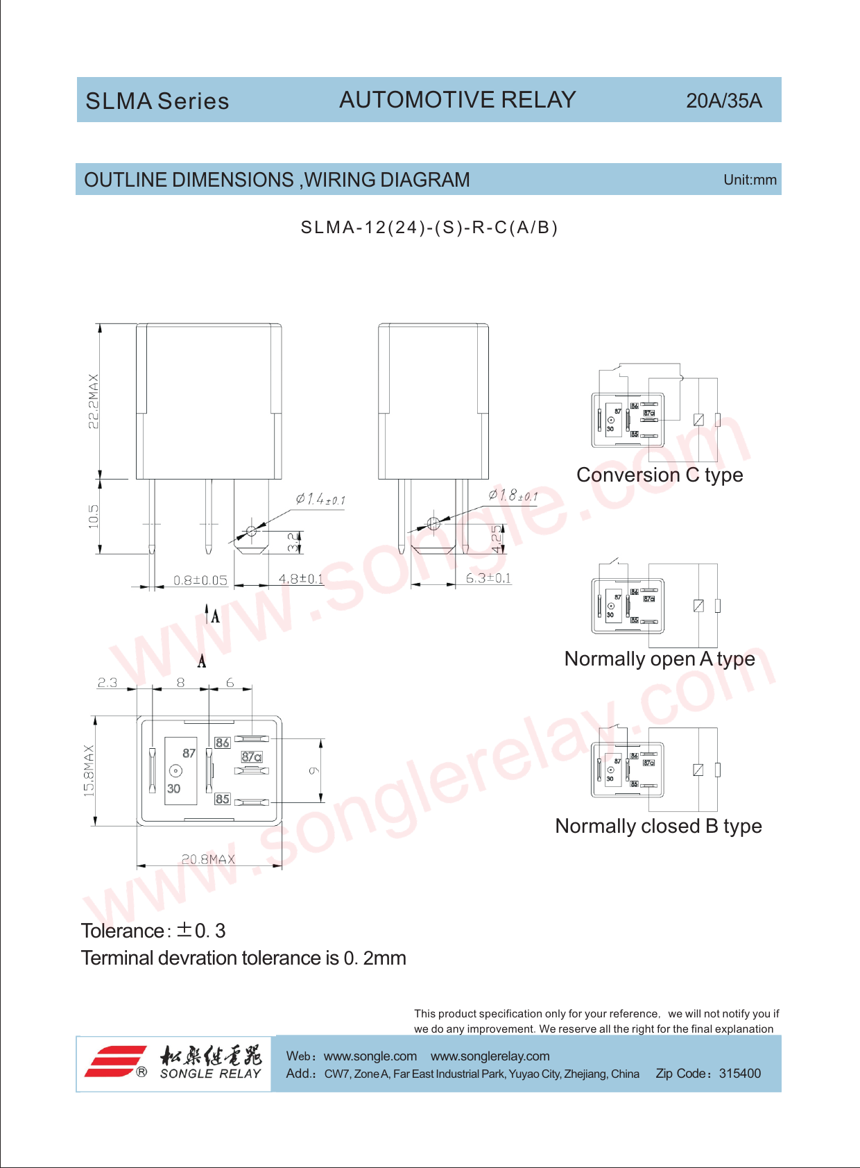 SLMA Series AUTOMOTIVE RELAY 20A/35A OUTLINE DIMENSIONS ,WIRING DIAGRAM Unit:mm S L M A - 1 2 ( 2 4 ) - ( S ) - R - C ( A / B ) Conversion C type Normally open A type Normally closed B type Tolerance:±0.3 Terminal devration tolerance is 0.2mm This product specification only for your reference, we will not notify you if we do any improvement.We reserve all the right for the final explanation Web:www.songle.com www.songlerelay.com Email:sale@songle.com Web:www.songle.com www.songlerelay.com Add.:CW7, Zone A, Far East Industrial Park, Yuyao City, Zhejiang, China i Z p Code:315400 Add.:CW7, Zone A, Far East Industrial Park, Yuyao City, Zhejiang, China Zip Code:315400 Tel.: +86 574 62717777 62762658 62721968 a F x:+86 574 62721978 Document Outline 页 1 页 2