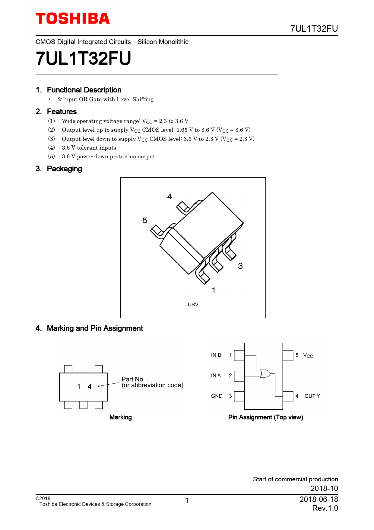 7UL1T32FU CMOS Digital Integrated Circuits Silicon Monolithic 7UL1T32FU 1. Functional Description • 2-Input OR Gate with Level Shifting 2. Features (1) Wide operating voltage range: VCC = 2.3 to 3.6 V (2) Output level up to supply VCC CMOS level: 1.65 V to 3.6 V (VCC = 3.6 V) (3) Output level down to supply VCC CMOS level: 3.6 V to 2.3 V (VCC = 2.3 V) (4) 3.6 V tolerant inputs (5) 3.6 V power down protection output 3. Packaging USV 4. Marking and Pin Assignment Marking Pin Assignment (Top view) Start of commercial production 2018-10 ©2018 1 2018-06-18 Toshiba Electronic Devices & Storage Corporation Rev.1.0