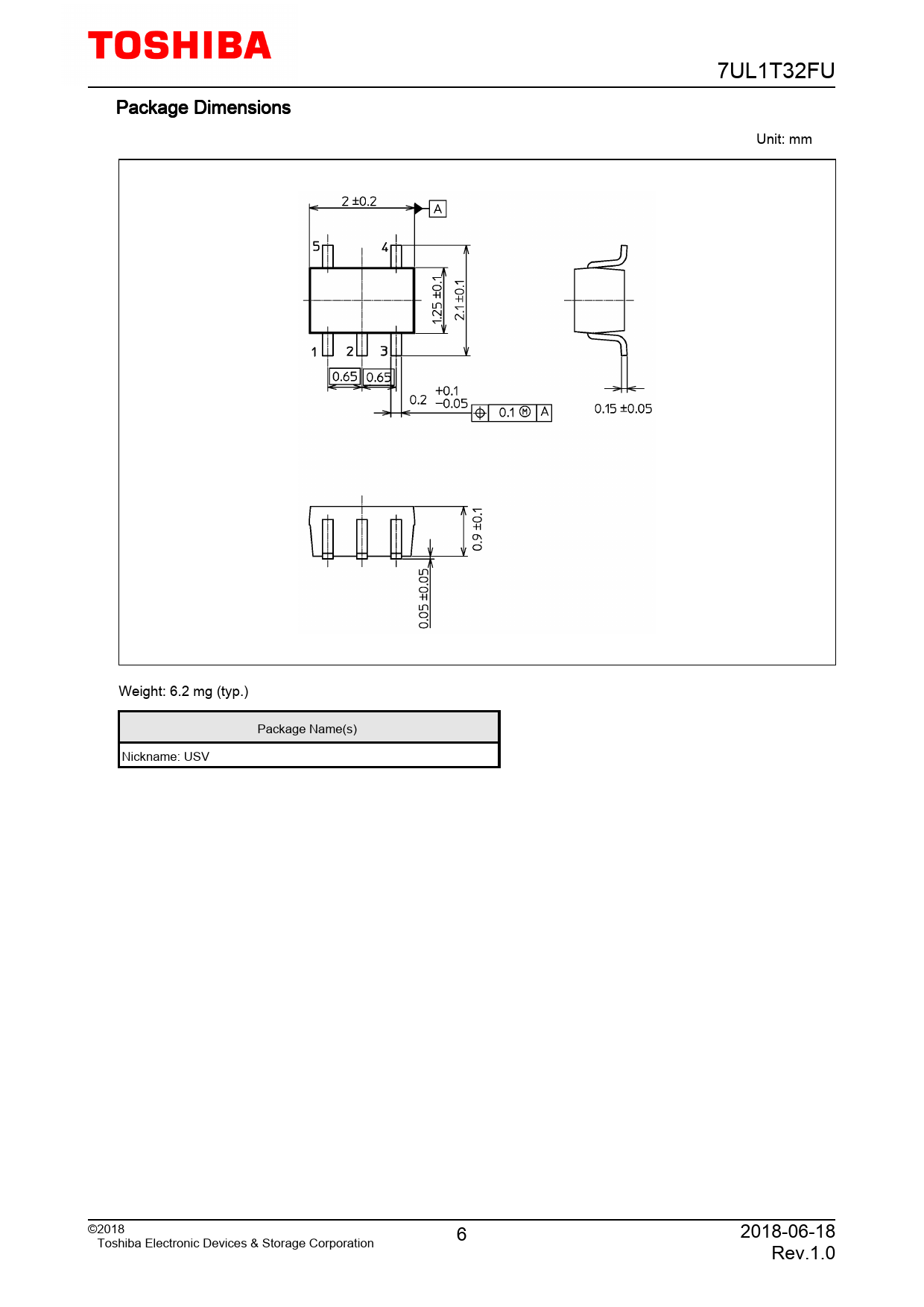 7UL1T32FU. Package. Dimensions. Unit:. mm. Weight:. 6.2. mg. (typ.). Package. Name(s). Nickname:. USV. ©2018. 6. 2018-06-18. Toshiba. Electronic. Devices