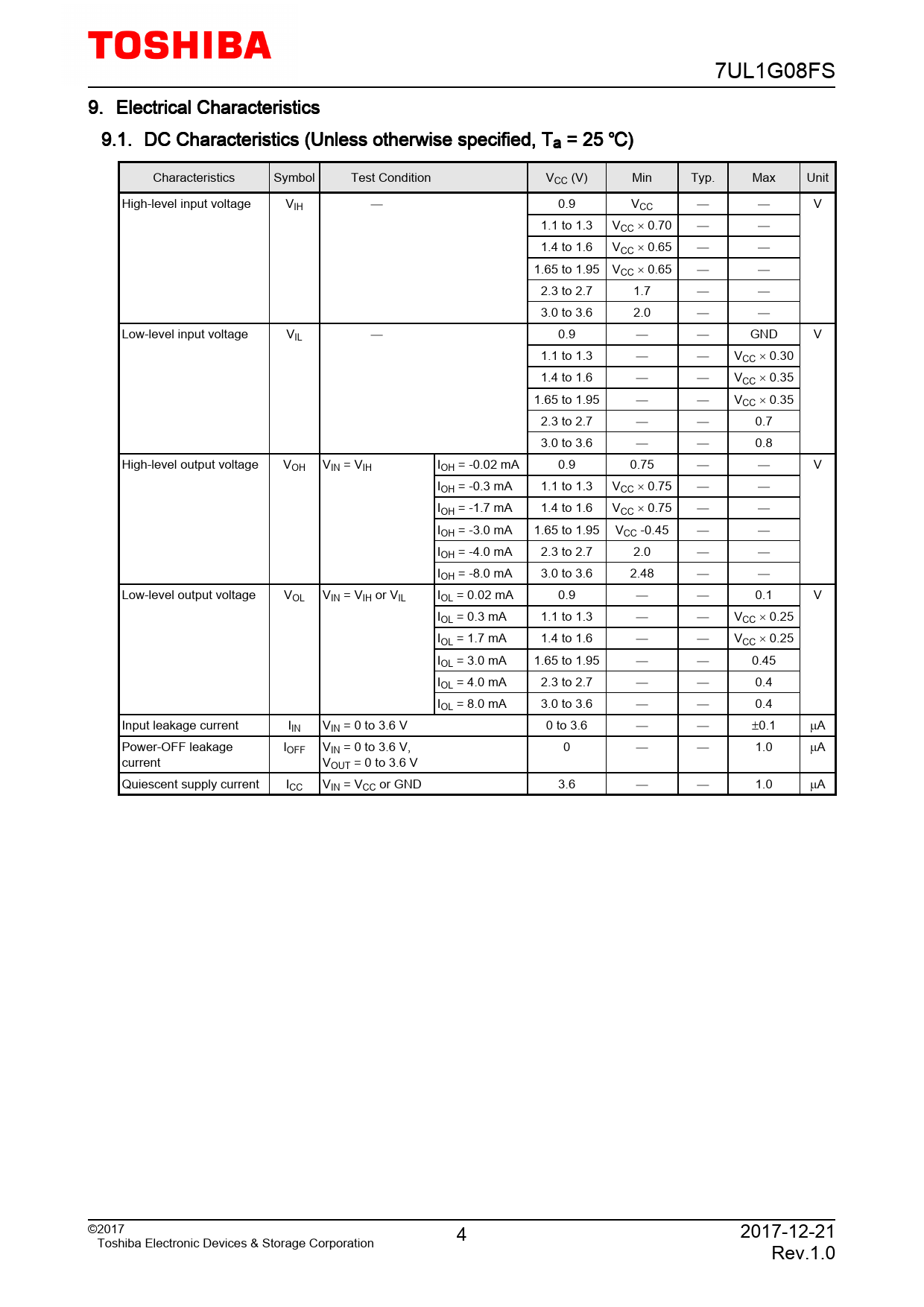 7UL1G08FS 9. Electrical Characteristics 9.1. DC Characteristics (Unless otherwise specified, Ta = 25 ) Characteristics Symbol Test Condition VCC (V) Min Typ. Max Unit High-level input voltage VIH 0.9 VCC V 1.1 to 1.3 VCC × 0.70 1.4 to 1.6 VCC × 0.65 1.65 to 1.95 VCC × 0.65 2.3 to 2.7 1.7 3.0 to 3.6 2.0 Low-level input voltage VIL 0.9 GND V 1.1 to 1.3 VCC × 0.30 1.4 to 1.6 VCC × 0.35 1.65 to 1.95 VCC × 0.35 2.3 to 2.7 0.7 3.0 to 3.6 0.8 High-level output voltage VOH VIN = VIH IOH = -0.02 mA 0.9 0.75 V IOH = -0.3 mA 1.1 to 1.3 VCC × 0.75 IOH = -1.7 mA 1.4 to 1.6 VCC × 0.75 IOH = -3.0 mA 1.65 to 1.95 VCC -0.45 IOH = -4.0 mA 2.3 to 2.7 2.0 IOH = -8.0 mA 3.0 to 3.6 2.48 Low-level output voltage VOL VIN = VIH or VIL IOL = 0.02 mA 0.9 0.1 V IOL = 0.3 mA 1.1 to 1.3 VCC × 0.25 IOL = 1.7 mA 1.4 to 1.6 VCC × 0.25 IOL = 3.0 mA 1.65 to 1.95 0.45 IOL = 4.0 mA 2.3 to 2.7 0.4 IOL = 8.0 mA 3.0 to 3.6 0.4 Input leakage current IIN VIN = 0 to 3.6 V 0 to 3.6 ±0.1 µA Power-OFF leakage IOFF VIN = 0 to 3.6 V, 0 1.0 µA current VOUT = 0 to 3.6 V Quiescent supply current ICC VIN = VCC or GND 3.6 1.0 µA ©2017 4 2017-12-21 Toshiba Electronic Devices & Storage Corporation Rev.1.0