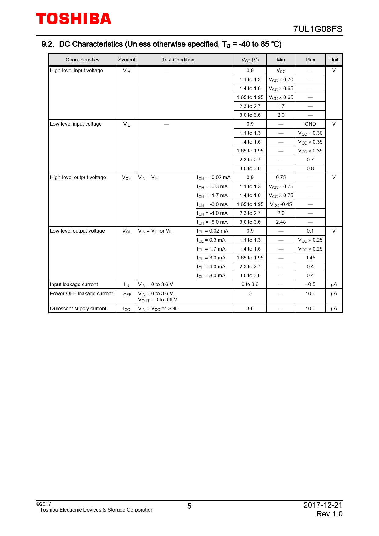 7UL1G08FS 9.2. DC Characteristics (Unless otherwise specified, Ta = -40 to 85 ) Characteristics Symbol Test Condition VCC (V) Min Max Unit High-level input voltage VIH 0.9 VCC V 1.1 to 1.3 VCC × 0.70 1.4 to 1.6 VCC × 0.65 1.65 to 1.95 VCC × 0.65 2.3 to 2.7 1.7 3.0 to 3.6 2.0 Low-level input voltage VIL 0.9 GND V 1.1 to 1.3 VCC × 0.30 1.4 to 1.6 VCC × 0.35 1.65 to 1.95 VCC × 0.35 2.3 to 2.7 0.7 3.0 to 3.6 0.8 High-level output voltage VOH VIN = VIH IOH = -0.02 mA 0.9 0.75 V IOH = -0.3 mA 1.1 to 1.3 VCC × 0.75 IOH = -1.7 mA 1.4 to 1.6 VCC × 0.75 IOH = -3.0 mA 1.65 to 1.95 VCC -0.45 IOH = -4.0 mA 2.3 to 2.7 2.0 IOH = -8.0 mA 3.0 to 3.6 2.48 Low-level output voltage VOL VIN = VIH or VIL IOL = 0.02 mA 0.9 0.1 V IOL = 0.3 mA 1.1 to 1.3 VCC × 0.25 IOL = 1.7 mA 1.4 to 1.6 VCC × 0.25 IOL = 3.0 mA 1.65 to 1.95 0.45 IOL = 4.0 mA 2.3 to 2.7 0.4 IOL = 8.0 mA 3.0 to 3.6 0.4 Input leakage current IIN VIN = 0 to 3.6 V 0 to 3.6 ±0.5 µA Power-OFF leakage current IOFF VIN = 0 to 3.6 V, 0 10.0 µA VOUT = 0 to 3.6 V Quiescent supply current ICC VIN = VCC or GND 3.6 10.0 µA ©2017 5 2017-12-21 Toshiba Electronic Devices & Storage Corporation Rev.1.0