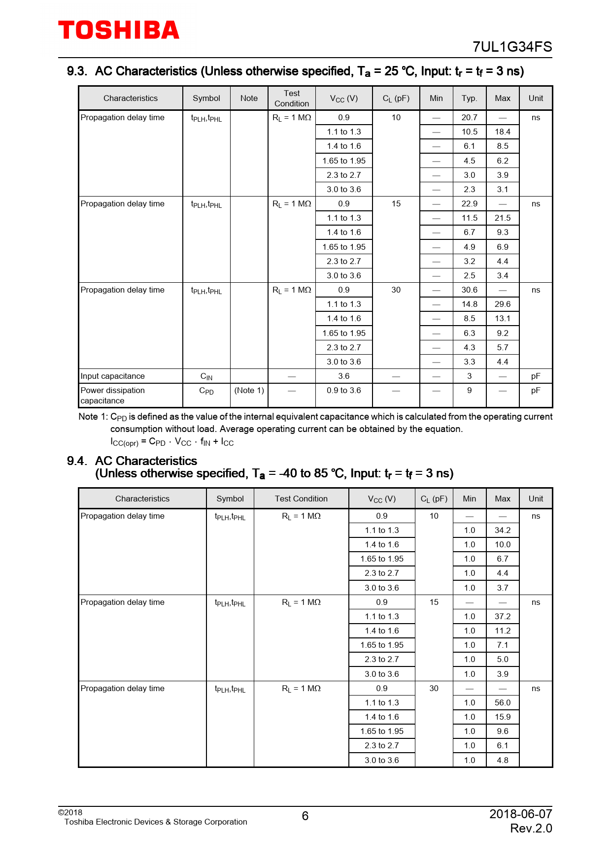 7UL1G34FS 9.3. AC Characteristics (Unless otherwise specified, Ta = 25 , Input: tr = tf = 3 ns) Test Characteristics Symbol Note VCC (V) CL (pF) Min Typ. Max Unit Condition Propagation delay time tPLH,tPHL RL = 1 MΩ 0.9 10 20.7 ns 1.1 to 1.3 10.5 18.4 1.4 to 1.6 6.1 8.5 1.65 to 1.95 4.5 6.2 2.3 to 2.7 3.0 3.9 3.0 to 3.6 2.3 3.1 Propagation delay time tPLH,tPHL RL = 1 MΩ 0.9 15 22.9 ns 1.1 to 1.3 11.5 21.5 1.4 to 1.6 6.7 9.3 1.65 to 1.95 4.9 6.9 2.3 to 2.7 3.2 4.4 3.0 to 3.6 2.5 3.4 Propagation delay time tPLH,tPHL RL = 1 MΩ 0.9 30 30.6 ns 1.1 to 1.3 14.8 29.6 1.4 to 1.6 8.5 13.1 1.65 to 1.95 6.3 9.2 2.3 to 2.7 4.3 5.7 3.0 to 3.6 3.3 4.4 Input capacitance CIN 3.6 3 pF Power dissipation CPD (Note 1) 0.9 to 3.6 9 pF capacitance Note 1: CPD is defined as the value of the internal equivalent capacitance which is calculated from the operating current consumption without load. Average operating current can be obtained by the equation. ICC(opr) = CPDVCCfIN + ICC 9.4. AC Characteristics (Unless otherwise specified, Ta = -40 to 85 , Input: tr = tf = 3 ns) Characteristics Symbol Test Condition VCC (V) CL (pF) Min Max Unit Propagation delay time tPLH,tPHL RL = 1 MΩ 0.9 10 ns 1.1 to 1.3 1.0 34.2 1.4 to 1.6 1.0 10.0 1.65 to 1.95 1.0 6.7 2.3 to 2.7 1.0 4.4 3.0 to 3.6 1.0 3.7 Propagation delay time tPLH,tPHL RL = 1 MΩ 0.9 15 ns 1.1 to 1.3 1.0 37.2 1.4 to 1.6 1.0 11.2 1.65 to 1.95 1.0 7.1 2.3 to 2.7 1.0 5.0 3.0 to 3.6 1.0 3.9 Propagation delay time tPLH,tPHL RL = 1 MΩ 0.9 30 ns 1.1 to 1.3 1.0 56.0 1.4 to 1.6 1.0 15.9 1.65 to 1.95 1.0 9.6 2.3 to 2.7 1.0 6.1 3.0 to 3.6 1.0 4.8 ©2018 6 2018-06-07 Toshiba Electronic Devices & Storage Corporation Rev.2.0