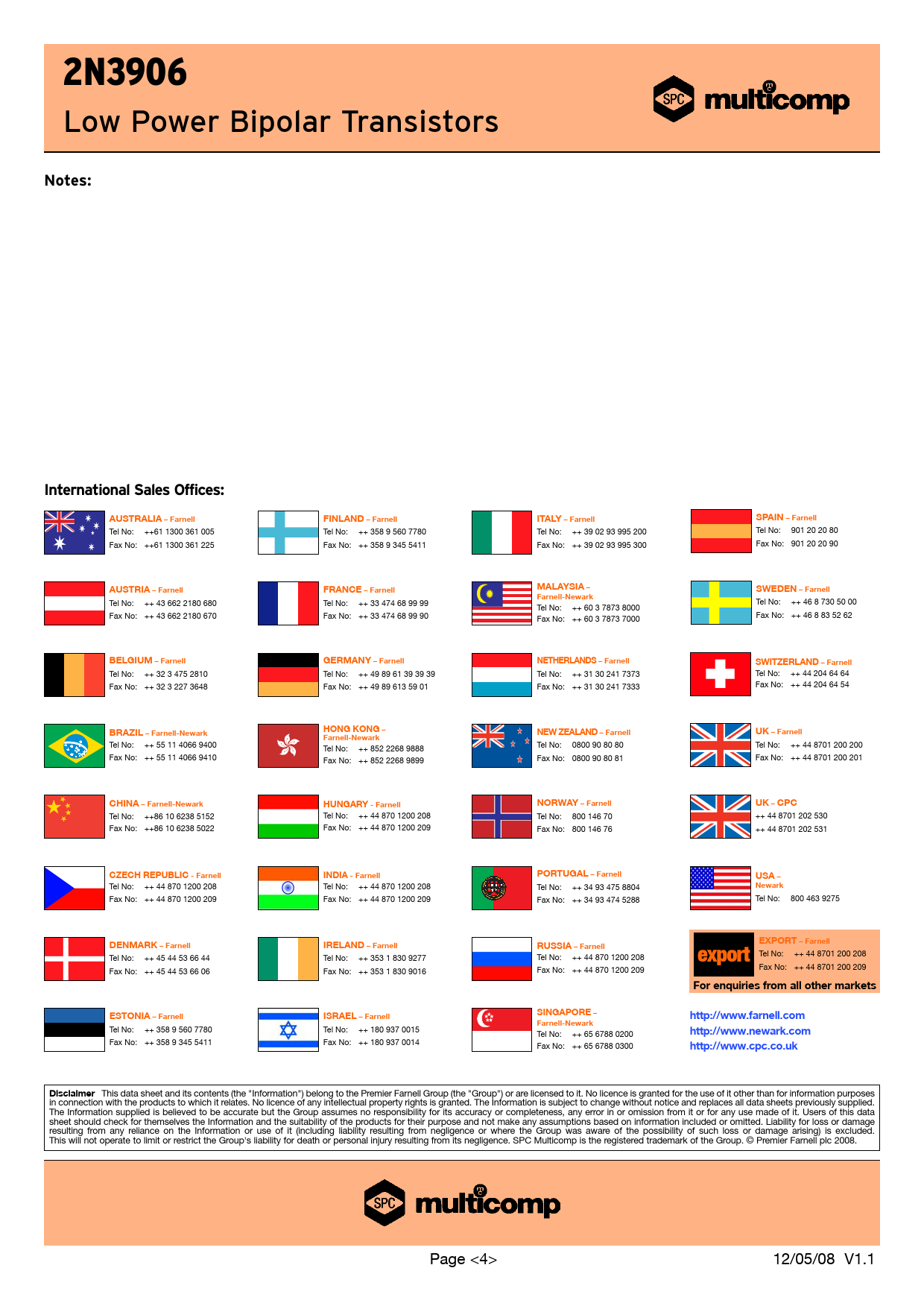 Notes: International Sales Offices: AUSTRALIA – Farnell FINLAND – Farnell ITALY – Farnell SPAIN – Farnell