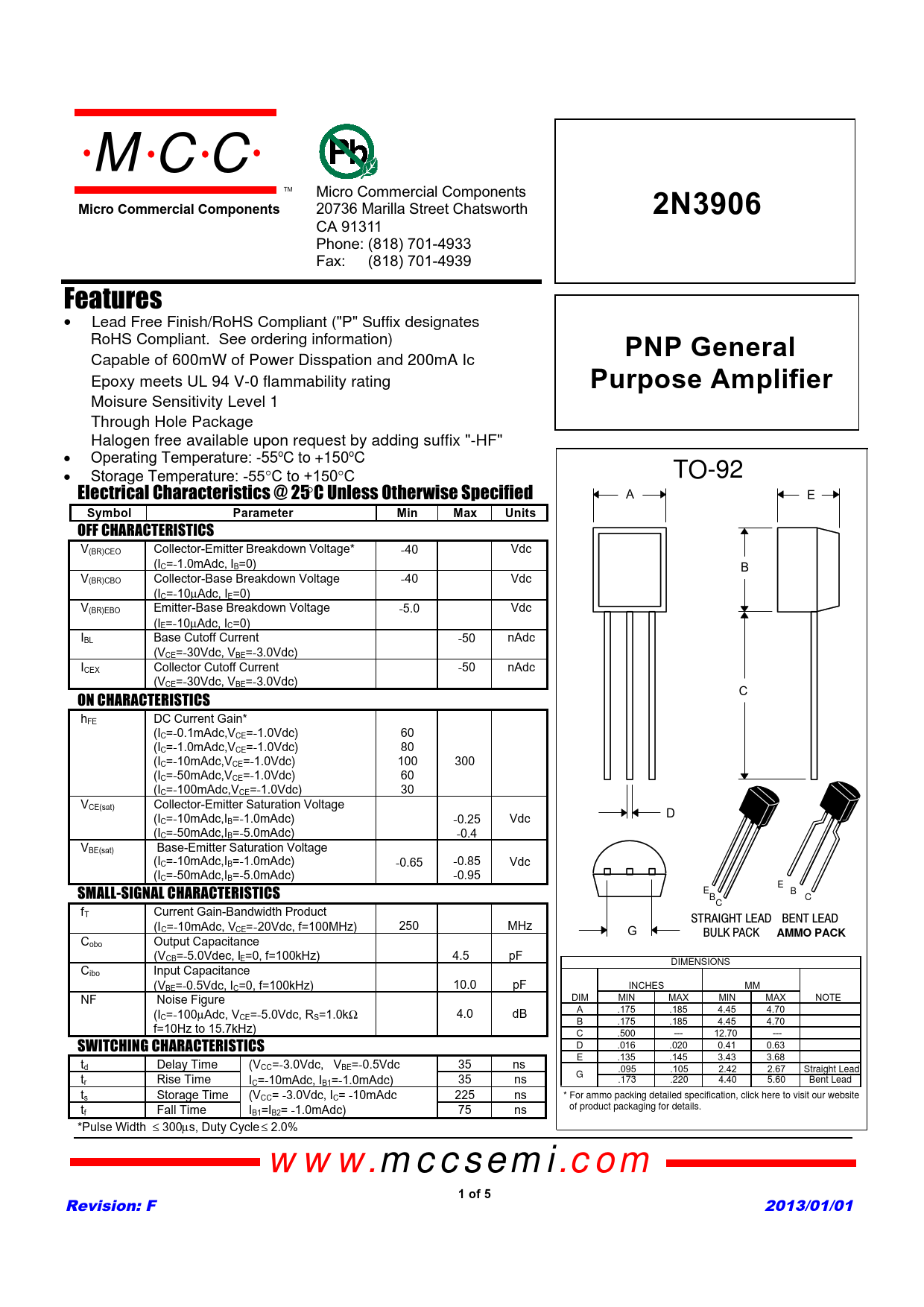 M C C TM omponents Micro Commercial Components 20736 Marilla Street Chatsworth 2N3906 !"# $ % !"# Features • Lead Free Finish/RoHS Compliant ("P" Suffix designates RoHS Compliant. See ordering information) PNP General x Capable of 600mW of Power Disspation and 200mA Ic x Epoxy meets UL 94 V-0 flammability rating Purpose Amplifier x Moisure Sensitivity Level 1 x Through Hole Package x Halogen free available upon request by adding suffix "-HF" • Operating Temperature: -55oC to +150oC • Storage Temperature: -55°C to +150°C TO-92 Electrical Characteristics @ 25°C Unless Otherwise Specified A E SymbolParameterMinMaxUnits OFF CHARACTERISTICS V(BR)CEO Collector-Emitter Breakdown Voltage* -40 Vdc (IC=-1.0mAdc, IB=0) B V(BR)CBO Collector-Base Breakdown Voltage -40 Vdc (IC=-10µAdc, IE=0) V(BR)EBO Emitter-Base Breakdown Voltage -5.0 Vdc (IE=-10µAdc, IC=0) IBL Base Cutoff Current -50 nAdc (VCE=-30Vdc, VBE=-3.0Vdc) ICEX Collector Cutoff Current -50 nAdc (VCE=-30Vdc, VBE=-3.0Vdc) C ON CHARACTERISTICS hFE DC Current Gain* (IC=-0.1mAdc,VCE=-1.0Vdc) 60 (IC=-1.0mAdc,VCE=-1.0Vdc) 80 (IC=-10mAdc,VCE=-1.0Vdc) 100 300 (IC=-50mAdc,VCE=-1.0Vdc) 60 (IC=-100mAdc,VCE=-1.0Vdc) 30 VCE(sat) Collector-Emitter Saturation Voltage D (I - C=-10mAdc,IB=-1.0mAdc) 0.25 Vdc (I - C=-50mAdc,IB=-5.0mAdc) 0.4 VBE(sat) Base-Emitter Saturation Voltage (IC=-10mAdc,IB=-1.0mAdc) -0.65 -0.85 Vdc (I - C=-50mAdc,IB=-5.0mAdc) 0.95 E SMALL-SIGNAL CHARACTERISTICS E B B C C fT Current Gain-Bandwidth Product STRAIGHT LEAD BENT LEAD (IC=-10mAdc, VCE=-20Vdc, f=100MHz) 250 MHz G BULK PACK AMMO PACK Cobo Output Capacitance (VCB=-5.0Vdec, IE=0, f=100kHz) 4.5 pF DIMENSIONS Cibo Input Capacitance (VBE=-0.5Vdc, IC=0, f=100kHz) 10.0 pF INCHES MM NF Noise Figure DIM MIN MAX MIN MAX NOTE A .175 .185 4.45 4.70 (IC=-100µAdc, VCE=-5.0Vdc, RS=1.0kΩ 4.0 dB B .175 .185 4.45 4.70 f=10Hz to 15.7kHz) C .500 --- 12.70 --- SWITCHING CHARACTERISTICS D .016 .020 0.41 0.63 E .135 .145 3.43 3.68 td Delay Time (VCC=-3.0Vdc, VBE=-0.5Vdc 35 ns .095 .105 2.42 2.67 Straight Lead G tr Rise Time IC=-10mAdc, IB1=-1.0mAdc) 35 ns .173 .220 4.40 5.60 Bent Lead ts Storage Time (VCC= -3.0Vdc, IC= -10mAdc 225 ns * For ammo packing detailed specification, click here to visit our website t of product packaging for details. f Fall Time IB1=IB2= -1.0mAdc) 75 ns *Pulse Width ≤ 300µs, Duty Cycle ≤ 2.0% www.mccsemi.com 1 of 5 Revision: F 2013/01/01