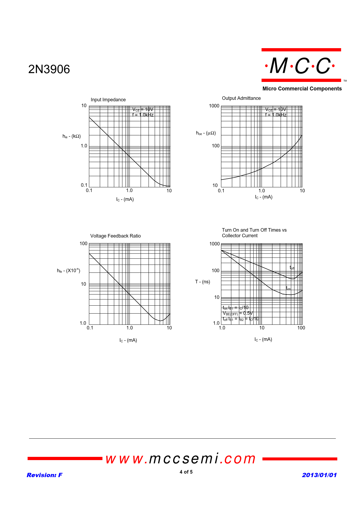 Input Impedance Output Admittance 10 1000 VCE = 10V VCE = 10V f = 1.0kHz f = 1.0kHz h h oe - (µΩ) ie - (kΩ) 1.0 100 0.1 10 0.1 1.0 10 0.1 1.0 10 I I C - (mA) C - (mA) Turn On and Turn Off Times vs Voltage Feedback Ratio Collector Current 100 1000 toff hfe - (X10-4) 100 T - (ns) 10 ton 10 ton IB1 = IC/10 VBE(OFF) = 0.5V toff IB1 = IB2 = IC/10 1.0 1.0 0.1 1.0 10 1.0 10 100 IC - (mA) IC - (mA) www.mccsemi.com Revision: F