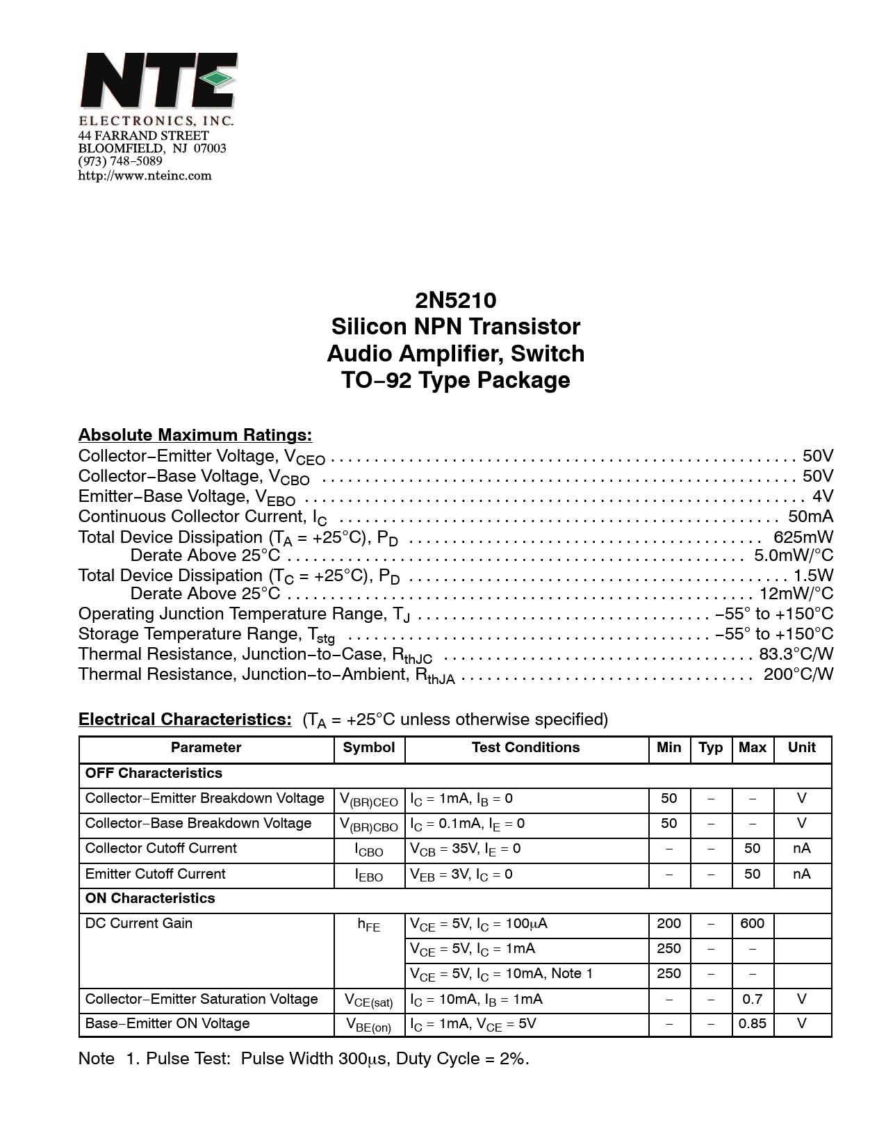 2N5210. Silicon NPN Transistor. Audio Amplifier, Switch. TO−92 Type Package. Absolute Maximum Ratings: