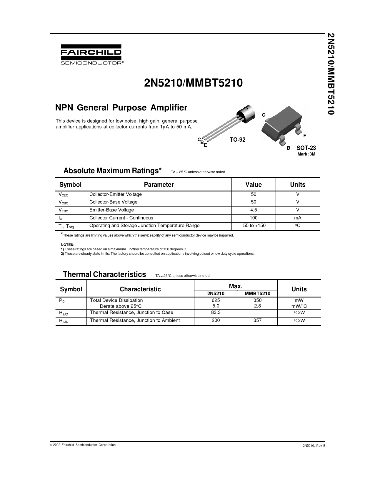 2N5210/MMBT52102N5210/MMBT5210NPN General Purpose AmplifierC This device is designed for low noise, high gain, general purpose amplifier applications at collector currents from 1µA to 50 mA. ECTO-92BEBSOT-23Mark: 3MAbsolute Maximum Ratings* TA = 25°C unless otherwise noted SymbolParameterValueUnits VCEO Collector-Emitter Voltage 50 V VCBO Collector-Base Voltage 50 V VEBO Emitter-Base Voltage 4.5 V IC Collector Current - Continuous 100 mA TJ, Tstg Operating and Storage Junction Temperature Range -55 to +150 °C *These ratings are limiting values above which the serviceability of any semiconductor device may be impaired. NOTES : 1) These ratings are based on a maximum junction temperature of 150 degrees C. 2) These are steady state limits. The factory should be consulted on applications involving pulsed or low duty cycle operations. Thermal Characteristics TA = 25°C unless otherwise noted Max.SymbolCharacteristicUnits2N5210 MMBT5210 P Total Device Dissipation 625 350 mW D Derate above 25°C 5.0 2.8 mW/°C Rθ Thermal Resistance, Junction to Case 83.3 °C/W JC Rθ Thermal Resistance, Junction to Ambient 200 357 °C/W JA 2002 Fairchild Semiconductor Corporation 2N5210, Rev B