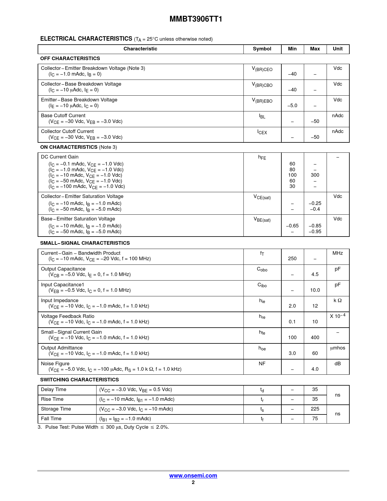 MMBT3906TT1. ELECTRICAL CHARACTERISTICS. Characteristic. Symbol. Min. Max. Unit. OFF CHARACTERISTICS. ON CHARACTERISTICS