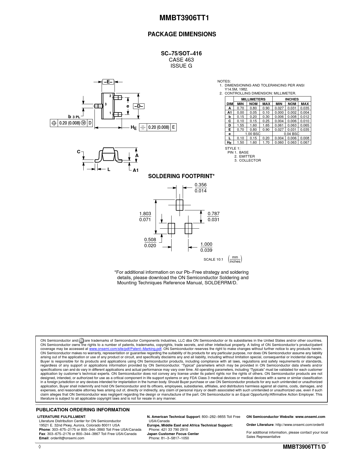 MMBT3906TT1PACKAGE DIMENSIONSSC−75/SOT−416 CASE 463 ISSUE G NOTES: −E− 1. DIMENSIONING AND TOLERANCING PER ANSI Y14.5M, 1982. 2. CONTROLLING DIMENSION: MILLIMETER. 2MILLIMETERSINCHES3DIMMINNOMMAXMINNOMMAXe−D−A 0.70 0.80 0.90 0.027 0.031 0.035 1A1 0.00 0.05 0.10 0.000 0.002 0.004 b 3 PLb 0.15 0.20 0.30 0.006 0.008 0.012 0.20 (0.008) C 0.10 0.15 0.25 0.004 0.006 0.010 M D H 0.20 (0.008) E D 1.55 1.60 1.65 0.061 0.063 0.065 EE 0.70 0.80 0.90 0.027 0.031 0.035 e 1.00 BSC 0.04 BSC L 0.10 0.15 0.20 0.004 0.006 0.008 HE 1.50 1.60 1.70 0.060 0.063 0.067 STYLE 1: C PIN 1. BASE A 2. EMITTER 3. COLLECTOR LA1SOLDERING FOOTPRINT* 0.356 0.014 1.803 0.787 0.071 0.031 0.508 0.020 1.000 0.039 SCALE 10:1 ǒ mm Ǔ inches *For additional information on our Pb−Free strategy and soldering details, please download the ON Semiconductor Soldering and Mounting Techniques Reference Manual, SOLDERRM/D. ON Semiconductor and are trademarks of Semiconductor Components Industries, LLC dba ON Semiconductor or its subsidiaries in the United States and/or other countries. ON Semiconductor owns the rights to a number of patents, trademarks, copyrights, trade secrets, and other intellectual property. A listing of ON Semiconductor’s product/patent coverage may be accessed at www.onsemi.com/site/pdf/Patent−Marking.pdf. ON Semiconductor reserves the right to make changes without further notice to any products herein. ON Semiconductor makes no warranty, representation or guarantee regarding the suitability of its products for any particular purpose, nor does ON Semiconductor assume any liability arising out of the application or use of any product or circuit, and specifically disclaims any and all liability, including without limitation special, consequential or incidental damages. Buyer is responsible for its products and applications using ON Semiconductor products, including compliance with all laws, regulations and safety requirements or standards, regardless of any support or applications information provided by ON Semiconductor. “Typical” parameters which may be provided in ON Semiconductor data sheets and/or specifications can and do vary in different applications and actual performance may vary over time. All operating parameters, including “Typicals” must be validated for each customer application by customer’s technical experts. ON Semiconductor does not convey any license under its patent rights nor the rights of others. ON Semiconductor products are not designed, intended, or authorized for use as a critical component in life support systems or any FDA Class 3 medical devices or medical devices with a same or similar classification in a foreign jurisdiction or any devices intended for implantation in the human body. Should Buyer purchase or use ON Semiconductor products for any such unintended or unauthorized application, Buyer shall indemnify and hold ON Semiconductor and its officers, employees, subsidiaries, affiliates, and distributors harmless against all claims, costs, damages, and expenses, and reasonable attorney fees arising out of, directly or indirectly, any claim of personal injury or death associated with such unintended or unauthorized use, even if such claim alleges that ON Semiconductor was negligent regarding the design or manufacture of the part. ON Semiconductor is an Equal Opportunity/Affirmative Action Employer. This literature is subject to all applicable copyright laws and is not for resale in any manner. PUBLICATION ORDERING INFORMATIONLITERATURE FULFILLMENT : N. American Technical Support : 800−282−9855 Toll Free ON Semiconductor Website : www.onsemi.com Literature Distribution Center for ON Semiconductor USA/Canada 19521 E. 32nd Pkwy, Aurora, Colorado 80011 USA Europe, Middle East and Africa Technical Support:Order Literature : http://www.onsemi.com/orderlit Phone : 303−675−2175 or 800−344−3860 Toll Free USA/Canada Phone: 421 33 790 2910 Fax : 303−675−2176 or 800−344−3867 Toll Free USA/Canada Japan Customer Focus Center For additional information, please contact your local Email : orderlit@onsemi.com Phone: 81−3−5817−1050 Sales Representative ◊ www.onsemi.comMMBT3906TT1/D7
