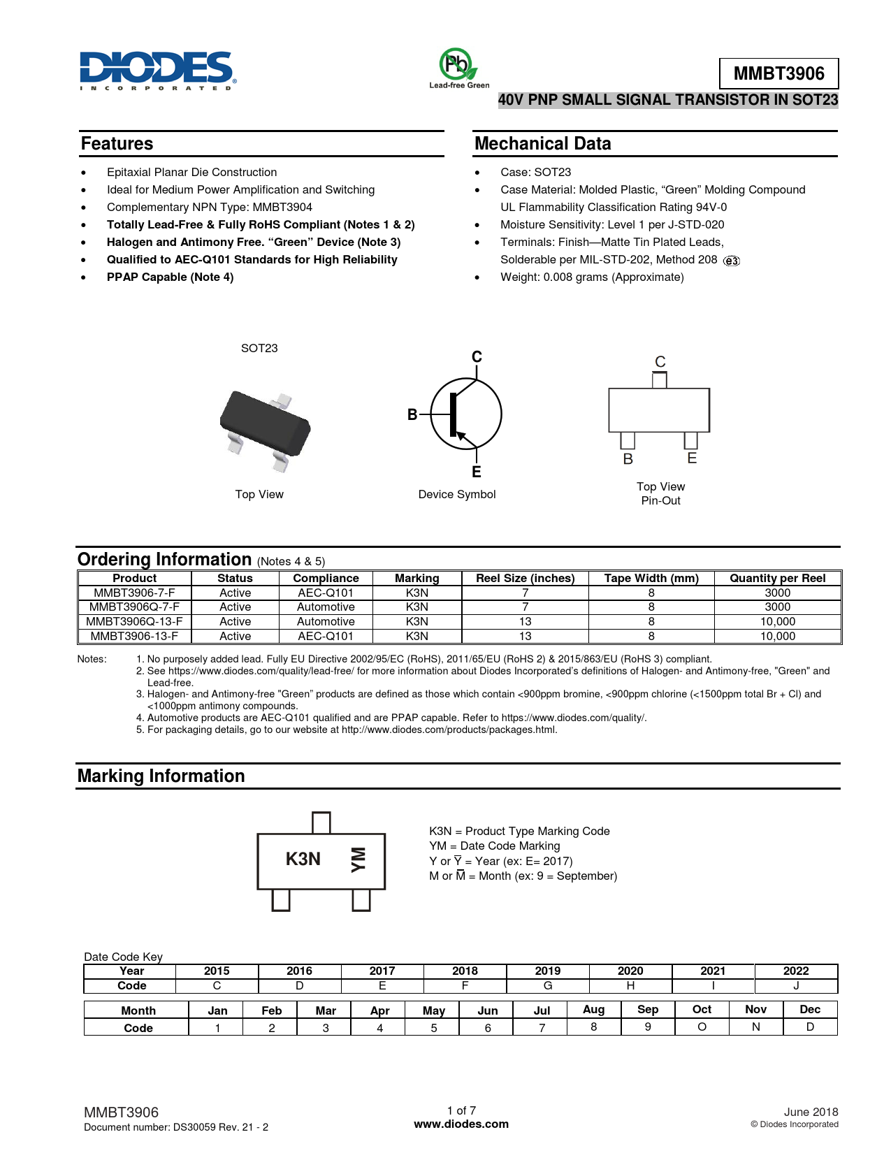 MMBT3906-7-F Active AEC-Q101 K3N 7 8 3000 MMBT3906Q-7-F Active Automotive K3N 7 8 3000 MMBT3906Q-13-F Active Automotive K3N 13 8 10,000 MMBT3906-13-F Active AEC-Q101 K3N 13 8 10,000 Notes: 1. No purposely added lead. Fully EU Directive 2002/95/EC (RoHS), 2011/65/EU (RoHS 2) & 2015/863/EU (RoHS 3) compliant. 2. See https://www.diodes.com/quality/lead-free/ for more information about Diodes Incorporated’s definitions of Halogen- and Antimony-free, "Green" and Lead-free. 3. Halogen- and Antimony-free "Green” products are defined as those which contain <900ppm bromine, <900ppm chlorine (<1500ppm total Br + Cl) and <1000ppm antimony compounds. 4. Automotive products are AEC-Q101 qualified and are PPAP capable. Refer to https://www.diodes.com/quality/. 5. For packaging details, go to our website at http://www.diodes.com/products/packages.html.
