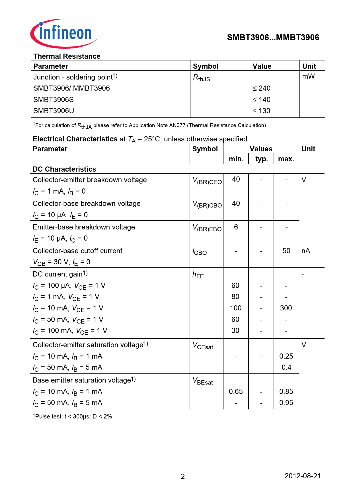 Junction - soldering point1) RthJS mW SMBT3906/ MMBT3906 ≤ 240 SMBT3906S ≤ 140 SMBT3906U ≤ 130 1For calculation of RthJA please refer to Application Note AN077 (Thermal Resistance Calculation)