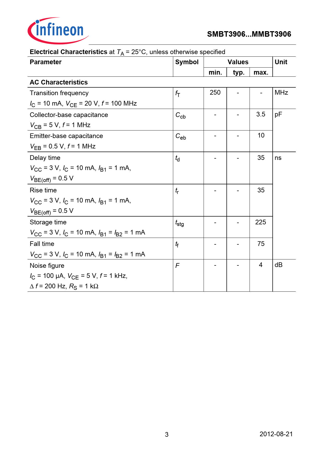 SMBT3906...MMBT3906. Electrical Characteristics. Parameter. Symbol. Values. Unit. min. typ. max. AC Characteristics