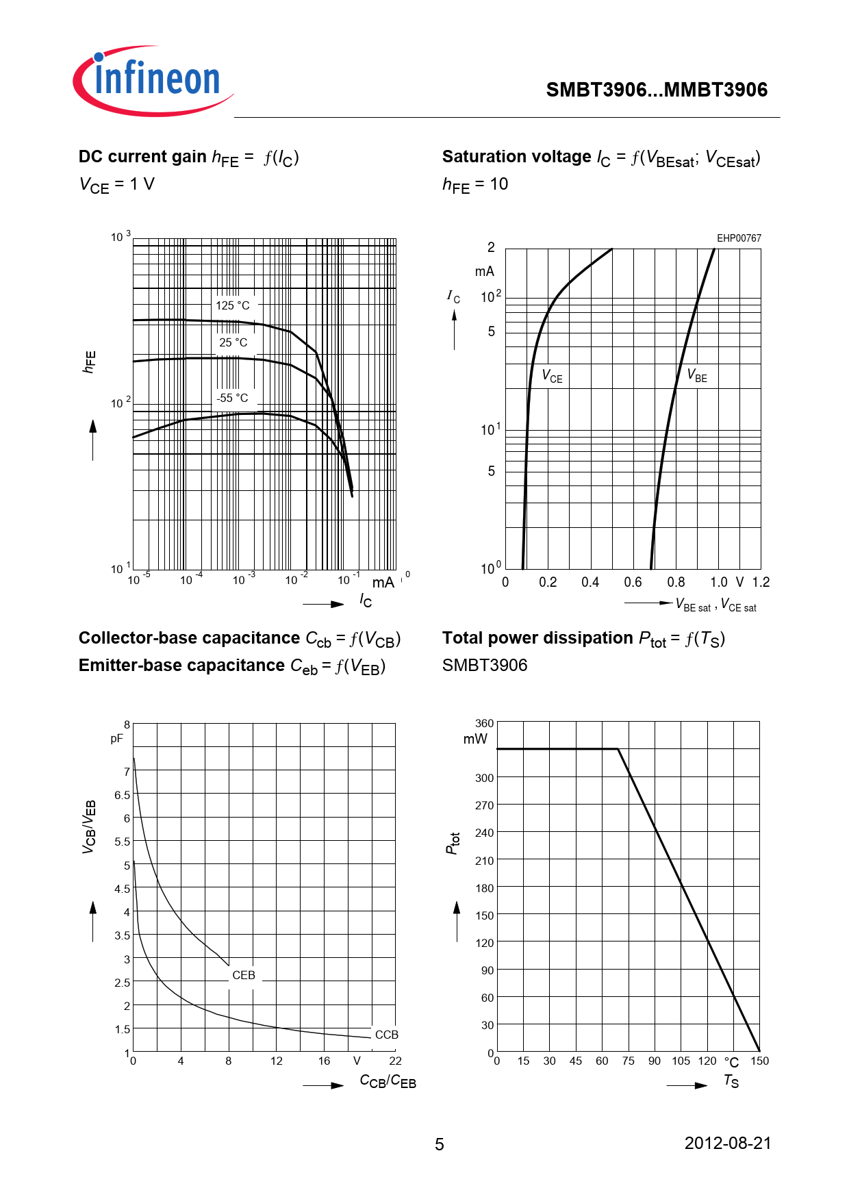 Ceb = ƒ(VEB) SMBT3906 8 360 pF mW 7 300 6.5 EB 270 6 /V 240 CB 5.5 tot V P 5 210 4.5 180 4 150 3.5 120 3 CEB 90 2.5 60 2 1.5 30 CCB 1 0 0 4 8 12 16 V 22 0 15 30 45 60 75 90 105 120 °C 150 CCB/CEB TS 5 2012-08-21