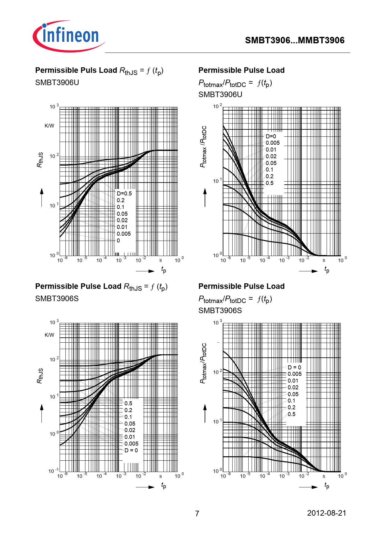 SMBT3906U Ptotmax/PtotDC = ƒ(tp) SMBT3906U 3 10 2 10 K/W totDC D=0 /P 0.005 0.01 S 2 10 0.02 thJ totmax R P 0.05 0.1 0.2 1 10 0.5 D=0.5 0.2 1 10 0.1 0.05 0.02 0.01 0.005 0 0 10 0 10 10 -6 10 -5 10 -4 10 -3 10 -2 10 0 s 10 -6 10 -5 10 -4 10 -3 10 -2 10 0 s tp tp