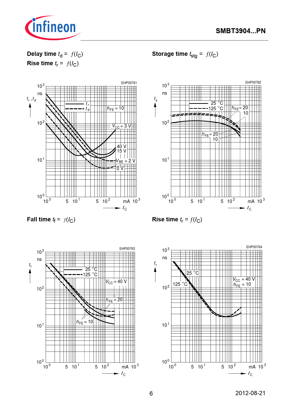 tr = ƒ(IC) EHP00761 EHP00762 10 3 10 3 ns ns t ,t t r d s t 25 C r t h = 10 d FE 125 C h = 20 FE 10 10 2 10 2 VCC = 3 V h = 20 FE 10 40 V 15 V 10 1 V BE = 2 V 10 1 0 V 10 0 10 0 10 0 5 10 1 5 10 2 mA 3 10 10 0 5 10 1 5 10 2 mA 3 10 Ι C Ι C