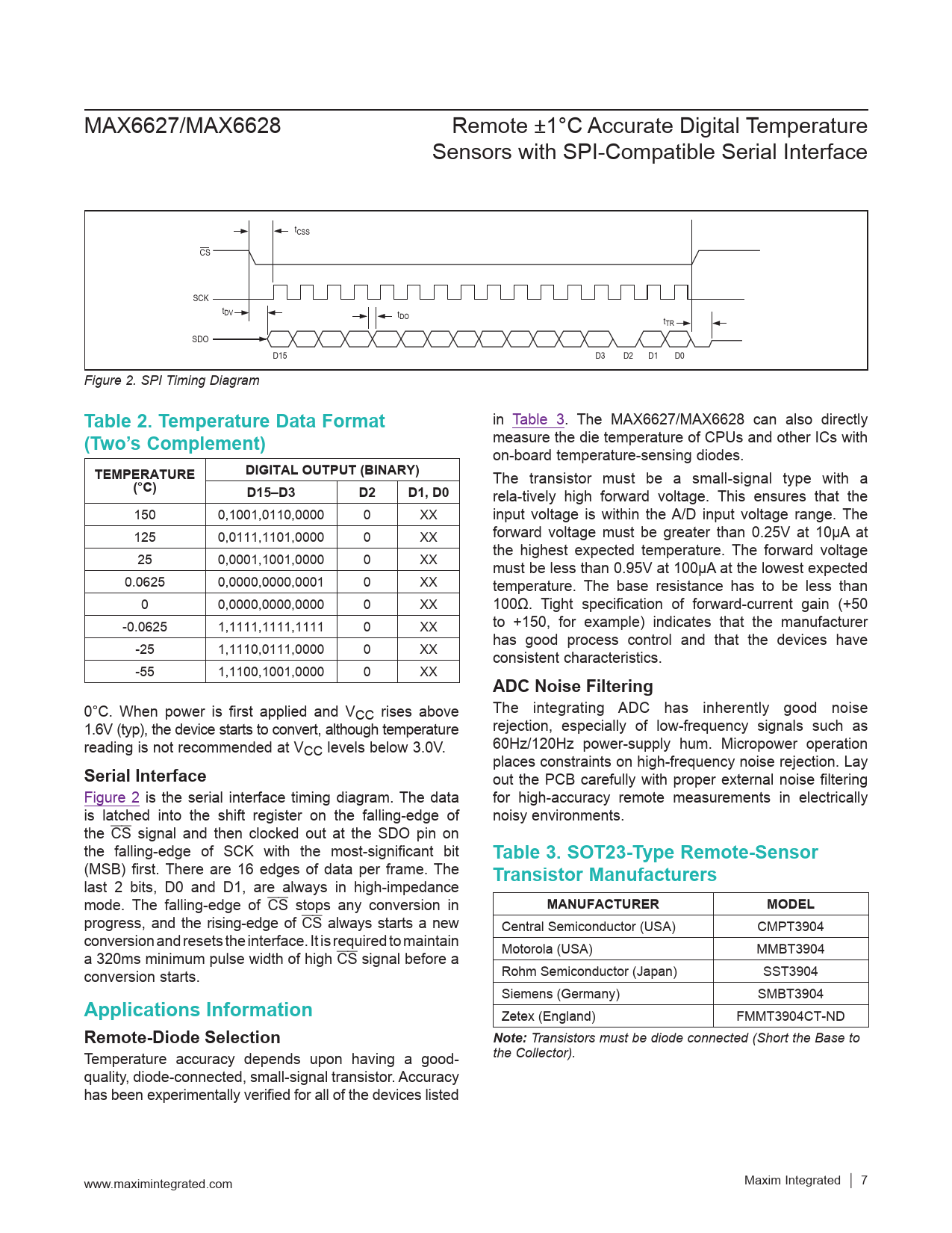 link to page 7 link to page 7 MAX6627/MAX6628 Remote ±1°C Accurate Digital Temperature Sensors with SPI-Compatible Serial Interface tCSS CS SCK tDV tDO tTR SDO D15 D3 D2 D1 D0 Figure 2. SPI Timing Diagram Table 2. Temperature Data Format in Table 3. The MAX6627/MAX6628 can also directly measure the die temperature of CPUs and other ICs with (Two’s Complement) on-board temperature-sensing diodes. TEMPERATUREDIGITAL OUTPUT (BINARY) The transistor must be a small-signal type with a (°C)D15–D3D2D1, D0 rela-tively high forward voltage. This ensures that the 150 0,1001,0110,0000 0 XX input voltage is within the A/D input voltage range. The 125 0,0111,1101,0000 0 XX forward voltage must be greater than 0.25V at 10µA at the highest expected temperature. The forward voltage 25 0,0001,1001,0000 0 XX must be less than 0.95V at 100µA at the lowest expected 0.0625 0,0000,0000,0001 0 XX temperature. The base resistance has to be less than 0 0,0000,0000,0000 0 XX 100Ω. Tight specification of forward-current gain (+50 to +150, for example) indicates that the manufacturer -0.0625 1,1111,1111,1111 0 XX has good process control and that the devices have -25 1,1110,0111,0000 0 XX consistent characteristics. -55 1,1100,1001,0000 0 XX ADC Noise Filtering 0°C. When power is first applied and VCC rises above The integrating ADC has inherently good noise 1.6V (typ), the device starts to convert, although temperature rejection, especially of low-frequency signals such as reading is not recommended at VCC levels below 3.0V. 60Hz/120Hz power-supply hum. Micropower operation places constraints on high-frequency noise rejection. Lay Serial Interface out the PCB carefully with proper external noise filtering Figure 2 is the serial interface timing diagram. The data for high-accuracy remote measurements in electrically is latched into the shift register on the falling-edge of noisy environments. the CS signal and then clocked out at the SDO pin on the falling-edge of SCK with the most-significant bit Table 3. SOT23-Type Remote-Sensor (MSB) first. There are 16 edges of data per frame. The Transistor Manufacturers last 2 bits, D0 and D1, are always in high-impedance mode. The falling-edge of CS stops any conversion in MANUFACTURERMODEL progress, and the rising-edge of CS always starts a new Central Semiconductor (USA) CMPT3904 conversion and resets the interface. It is required to maintain Motorola (USA) MMBT3904 a 320ms minimum pulse width of high CS signal before a conversion starts. Rohm Semiconductor (Japan) SST3904 Siemens (Germany) SMBT3904 Applications Information Zetex (England) FMMT3904CT-ND Remote-Diode SelectionNote: Transistors must be diode connected (Short the Base to Temperature accuracy depends upon having a good- the Collector). quality, diode-connected, small-signal transistor. Accuracy has been experimentally verified for all of the devices listed www.maximintegrated.com Maxim Integrated │ 7