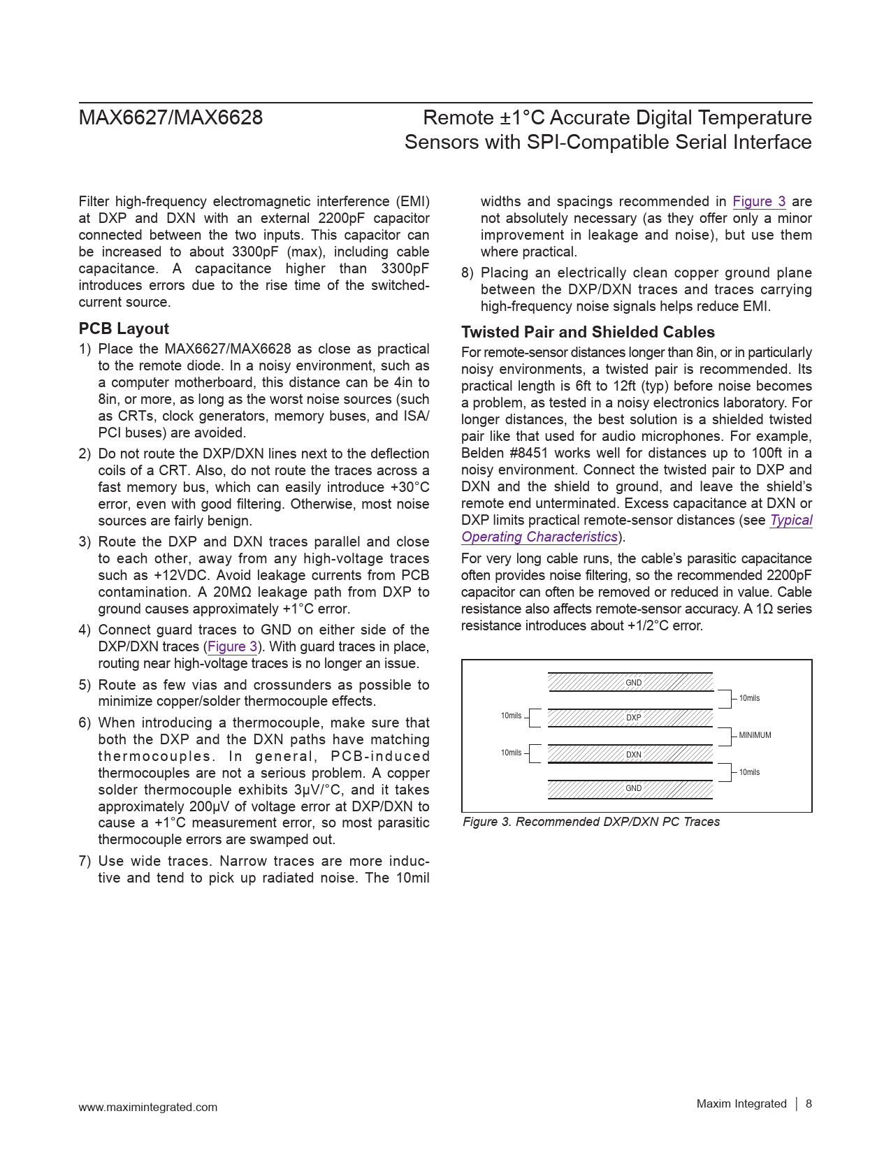 link to page 8 link to page 8 link to page 4 link to page 4 MAX6627/MAX6628 Remote ±1°C Accurate Digital Temperature Sensors with SPI-Compatible Serial Interface Filter high-frequency electromagnetic interference (EMI) widths and spacings recommended in Figure 3 are at DXP and DXN with an external 2200pF capacitor not absolutely necessary (as they offer only a minor connected between the two inputs. This capacitor can improvement in leakage and noise), but use them be increased to about 3300pF (max), including cable where practical. capacitance. A capacitance higher than 3300pF 8) Placing an electrically clean copper ground plane introduces errors due to the rise time of the switched- between the DXP/DXN traces and traces carrying current source. high-frequency noise signals helps reduce EMI. PCB LayoutTwisted Pair and Shielded Cables 1) Place the MAX6627/MAX6628 as close as practical For remote-sensor distances longer than 8in, or in particularly to the remote diode. In a noisy environment, such as noisy environments, a twisted pair is recommended. Its a computer motherboard, this distance can be 4in to practical length is 6ft to 12ft (typ) before noise becomes 8in, or more, as long as the worst noise sources (such a problem, as tested in a noisy electronics laboratory. For as CRTs, clock generators, memory buses, and ISA/ longer distances, the best solution is a shielded twisted PCI buses) are avoided. pair like that used for audio microphones. For example, 2) Do not route the DXP/DXN lines next to the deflection Belden #8451 works well for distances up to 100ft in a coils of a CRT. Also, do not route the traces across a noisy environment. Connect the twisted pair to DXP and fast memory bus, which can easily introduce +30°C DXN and the shield to ground, and leave the shield’s error, even with good filtering. Otherwise, most noise remote end unterminated. Excess capacitance at DXN or sources are fairly benign. DXP limits practical remote-sensor distances (see Typical 3) Route the DXP and DXN traces parallel and close Operating Characteristics). to each other, away from any high-voltage traces For very long cable runs, the cable’s parasitic capacitance such as +12VDC. Avoid leakage currents from PCB often provides noise filtering, so the recommended 2200pF contamination. A 20MΩ leakage path from DXP to capacitor can often be removed or reduced in value. Cable ground causes approximately +1°C error. resistance also affects remote-sensor accuracy. A 1Ω series 4) Connect guard traces to GND on either side of the resistance introduces about +1/2°C error. DXP/DXN traces (Figure 3). With guard traces in place, routing near high-voltage traces is no longer an issue. 5) Route as few vias and crossunders as possible to GND minimize copper/solder thermocouple effects. 10mils 6) When introducing a thermocouple, make sure that 10mils DXP both the DXP and the DXN paths have matching MINIMUM thermocouples. In general, PCB-induced 10mils DXN thermocouples are not a serious problem. A copper 10mils solder thermocouple exhibits 3µV/°C, and it takes GND approximately 200µV of voltage error at DXP/DXN to cause a +1°C measurement error, so most parasitic Figure 3. Recommended DXP/DXN PC Traces thermocouple errors are swamped out. 7) Use wide traces. Narrow traces are more induc- tive and tend to pick up radiated noise. The 10mil www.maximintegrated.com Maxim Integrated │ 8