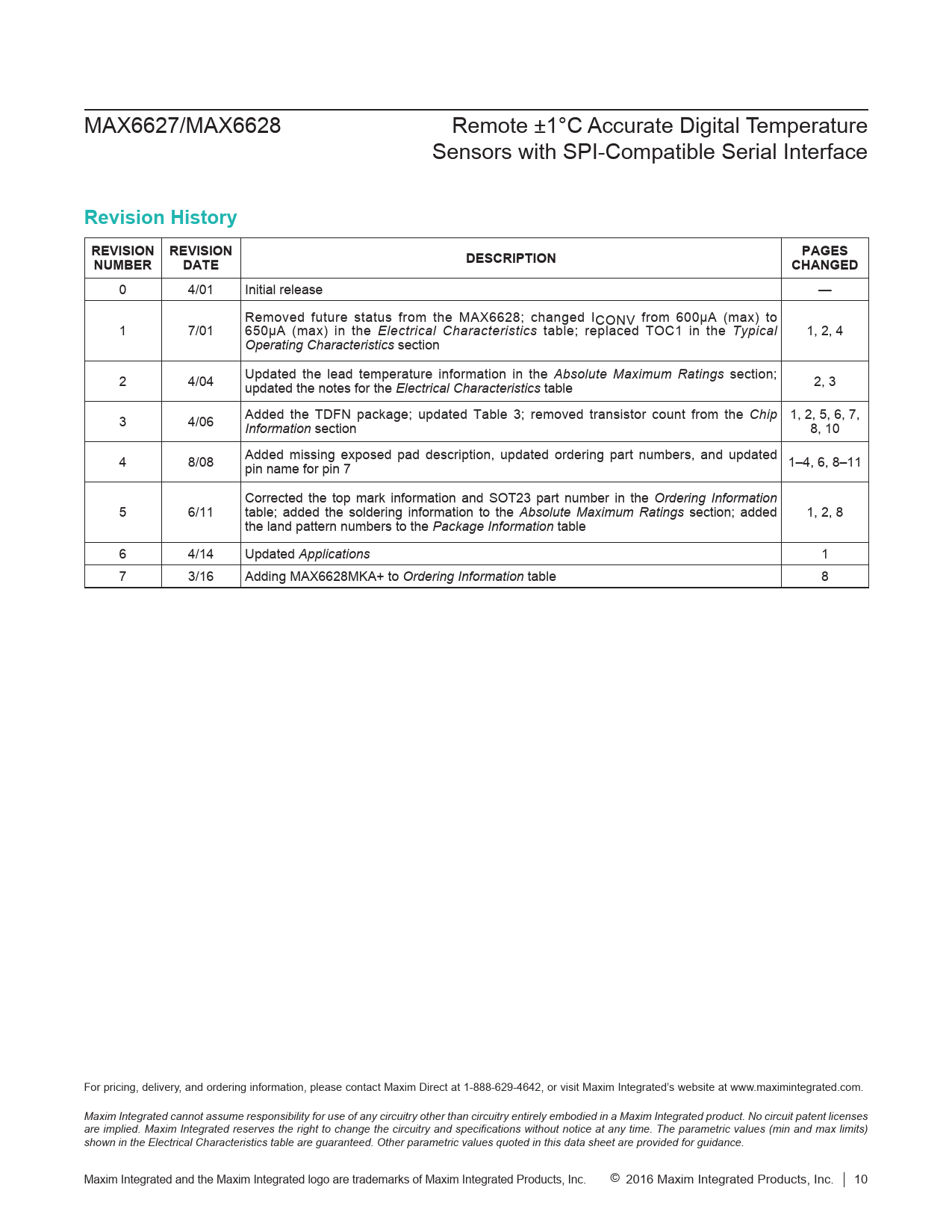 0 4/01 Initial release — Removed future status from the MAX6628; changed ICONV from 600µA (max) to 1 7/01 650µA (max) in the Electrical Characteristics table; replaced TOC1 in the Typical 1, 2, 4 Operating Characteristics section 2 4/04 Updated the lead temperature information in the Absolute Maximum Ratings section; updated the notes for the Electrical Characteristics table 2, 3 3 4/06 Added the TDFN package; updated Table 3; removed transistor count from the Chip 1, 2, 5, 6, 7, Information section 8, 10 4 8/08 Added missing exposed pad description, updated ordering part numbers, and updated pin name for pin 7 1–4, 6, 8–11 Corrected the top mark information and SOT23 part number in the Ordering Information 5 6/11 table; added the soldering information to the Absolute Maximum Ratings section; added 1, 2, 8 the land pattern numbers to the Package Information table 6 4/14 Updated Applications 1 7 3/16 Adding MAX6628MKA+ to Ordering Information table 8 For pricing, delivery, and ordering information, please contact Maxim Direct at 1-888-629-4642, or visit Maxim Integrated’s website at www.maximintegrated.com. Maxim Integrated cannot assume responsibility for use of any circuitry other than circuitry entirely embodied in a Maxim Integrated product. No circuit patent licenses are implied. Maxim Integrated reserves the right to change the circuitry and specifications without notice at any time. The parametric values (min and max limits) shown in the Electrical Characteristics table are guaranteed. Other parametric values quoted in this data sheet are provided for guidance. Maxim Integrated and the Maxim Integrated logo are trademarks of Maxim Integrated Products, Inc. © 2016 Maxim Integrated Products, Inc. │ 10