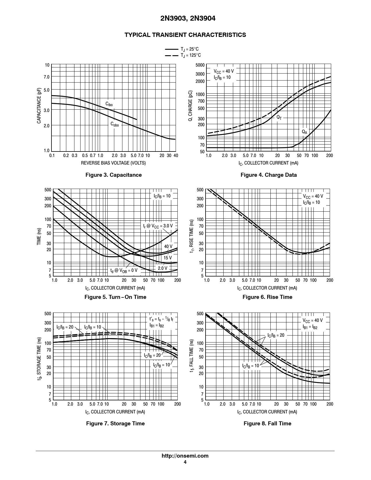 2N3903, 2N3904. TYPICAL TRANSIENT CHARACTERISTICS. Figure 3. Capacitance. Figure 4. Charge Data. Figure 5. Turn−On Time