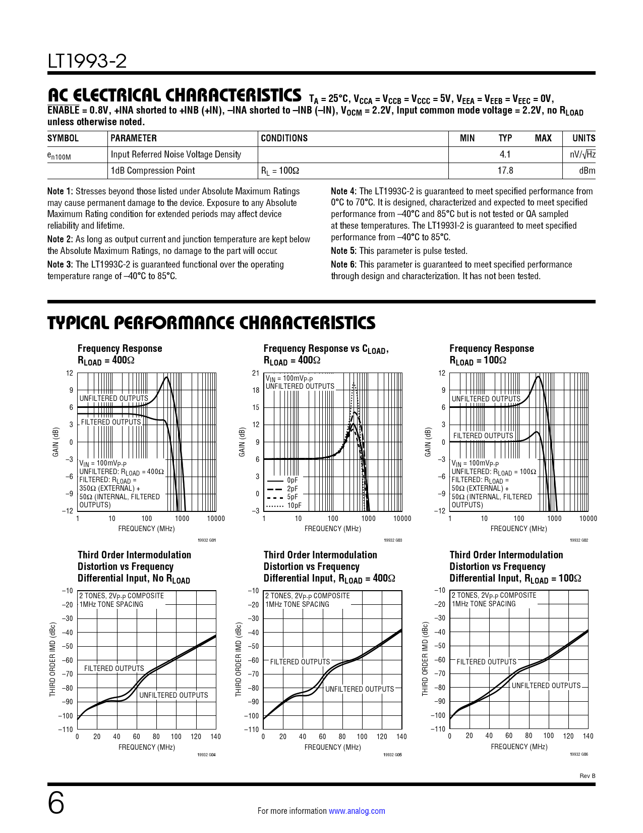LT1993-2 AC ELECTRICAL CHARACTERISTICS TA = 25°C, VCCA = VCCB = VCCC = 5V, VEEA = VEEB = VEEC = 0V,ENABLE = 0.8V, +INA shorted to +INB (+IN), –INA shorted to –INB (–IN), VOCM = 2.2V, Input common mode voltage = 2.2V, no RLOADunless otherwise noted. SYMBOLPARAMETERCONDITIONSMINTYPMAXUNITS en100M Input Referred Noise Voltage Density 4.1 nV/√Hz 1dB Compression Point RL = 100 17.8 dBm Note 1: Stresses beyond those listed under Absolute Maximum Ratings Note 4: The LT1993C-2 is guaranteed to meet specified performance from may cause permanent damage to the device. Exposure to any Absolute 0°C to 70°C. It is designed, characterized and expected to meet specified Maximum Rating condition for extended periods may affect device performance from –40°C and 85°C but is not tested or QA sampled reliability and lifetime. at these temperatures. The LT1993I-2 is guaranteed to meet specified Note 2: As long as output current and junction temperature are kept below performance from –40°C to 85°C. the Absolute Maximum Ratings, no damage to the part will occur. Note 5: This parameter is pulse tested. Note 3: The LT1993C-2 is guaranteed functional over the operating Note 6: This parameter is guaranteed to meet specified performance temperature range of –40°C to 85°C. through design and characterization. It has not been tested. TYPICAL PERFORMANCE CHARACTERISTICS Frequency ResponseFrequency Response vs CLOAD,Frequency ResponseRLOAD = 400RLOAD = 400RLOAD = 100 12 21 12 VIN = 100mVP-P 9 18 UNFILTERED OUTPUTS 9 UNFILTERED OUTPUTS UNFILTERED OUTPUTS 6 15 6 3 FILTERED OUTPUTS 12 3 FILTERED OUTPUTS 0 9 0 GAIN (dB) GAIN (dB) GAIN (dB) –3 6 V –3 IN = 100mVP-P VIN = 100mVP-P UNFILTERED: R UNFILTERED: R –6 LOAD = 400Ω 3 LOAD = 100Ω FILTERED: R –6 LOAD = 0pF FILTERED: RLOAD = 350Ω (EXTERNAL) + 2pF 50Ω (EXTERNAL) + –9 0 50Ω (INTERNAL, FILTERED 5pF –9 50Ω (INTERNAL, FILTERED OUTPUTS) 10pF OUTPUTS) –12 –3 –12 1 10 100 1000 10000 1 10 100 1000 10000 1 10 100 1000 10000 FREQUENCY (MHz) FREQUENCY (MHz) FREQUENCY (MHz) 19932 G01 19932 G03 19932 G02 Third Order IntermodulationThird Order IntermodulationThird Order IntermodulationDistortion vs FrequencyDistortion vs FrequencyDistortion vs FrequencyDifferential Input, No RLOADDifferential Input, RLOAD = 400Differential Input, RLOAD = 100 –10 –10 –10 2 TONES, 2V 2 TONES, 2V 2 TONES, 2V P-P COMPOSITE P-P COMPOSITE P-P COMPOSITE –20 1MHz TONE SPACING –20 1MHz TONE SPACING –20 1MHz TONE SPACING –30 –30 –30 –40 –40 –40 –50 –50 –50 –60 –60 –60 FILTERED OUTPUTS FILTERED OUTPUTS FILTERED OUTPUTS –70 –70 –70 –80 –80 UNFILTERED OUTPUTS –80 UNFILTERED OUTPUTS THIRD ORDER IMD (dBc) UNFILTERED OUTPUTS THIRD ORDER IMD (dBc) THIRD ORDER IMD (dBc) –90 –90 –90 –100 –100 –100 –110 –110 –110 0 20 40 60 80 100 120 140 0 20 40 60 80 100 120 140 0 20 40 60 80 100 120 140 FREQUENCY (MHz) FREQUENCY (MHz) FREQUENCY (MHz) 19932 G04 19932 G05 19932 G06 Rev B 6 For more information www.analog.com