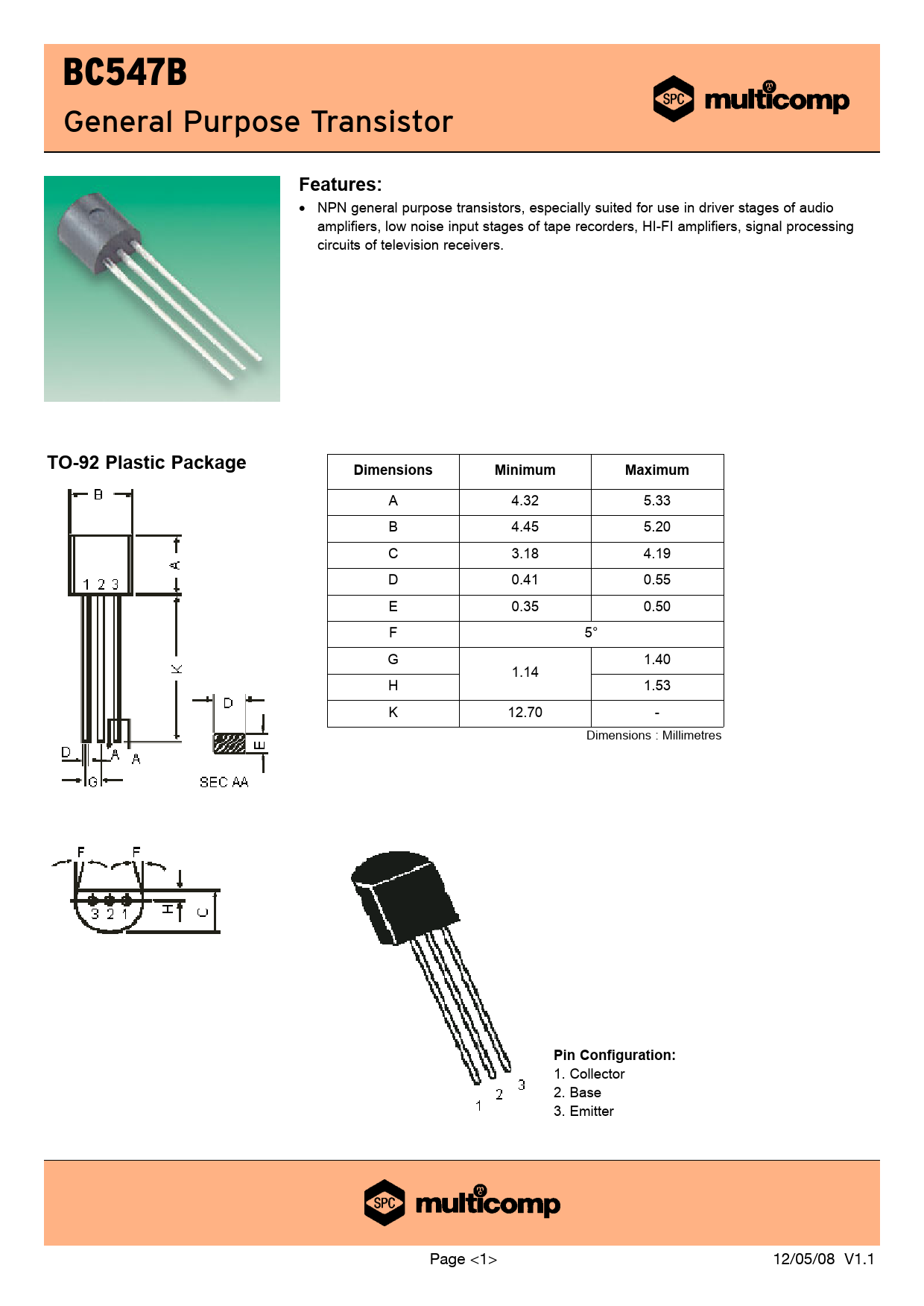 Pages / Page4 / 1 — Features:. TO-92 Plastic Package. Dimensions. Minimum. Maximum. Pin …