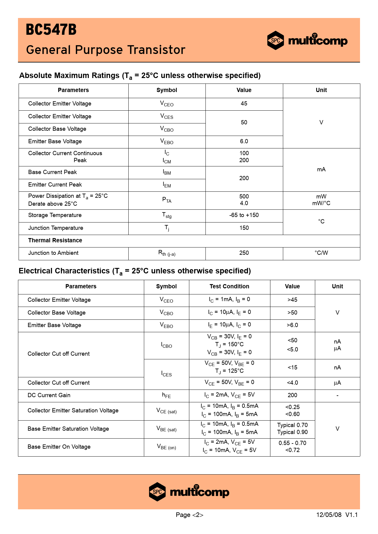 Datasheet BC547B (Multicomp) - 2