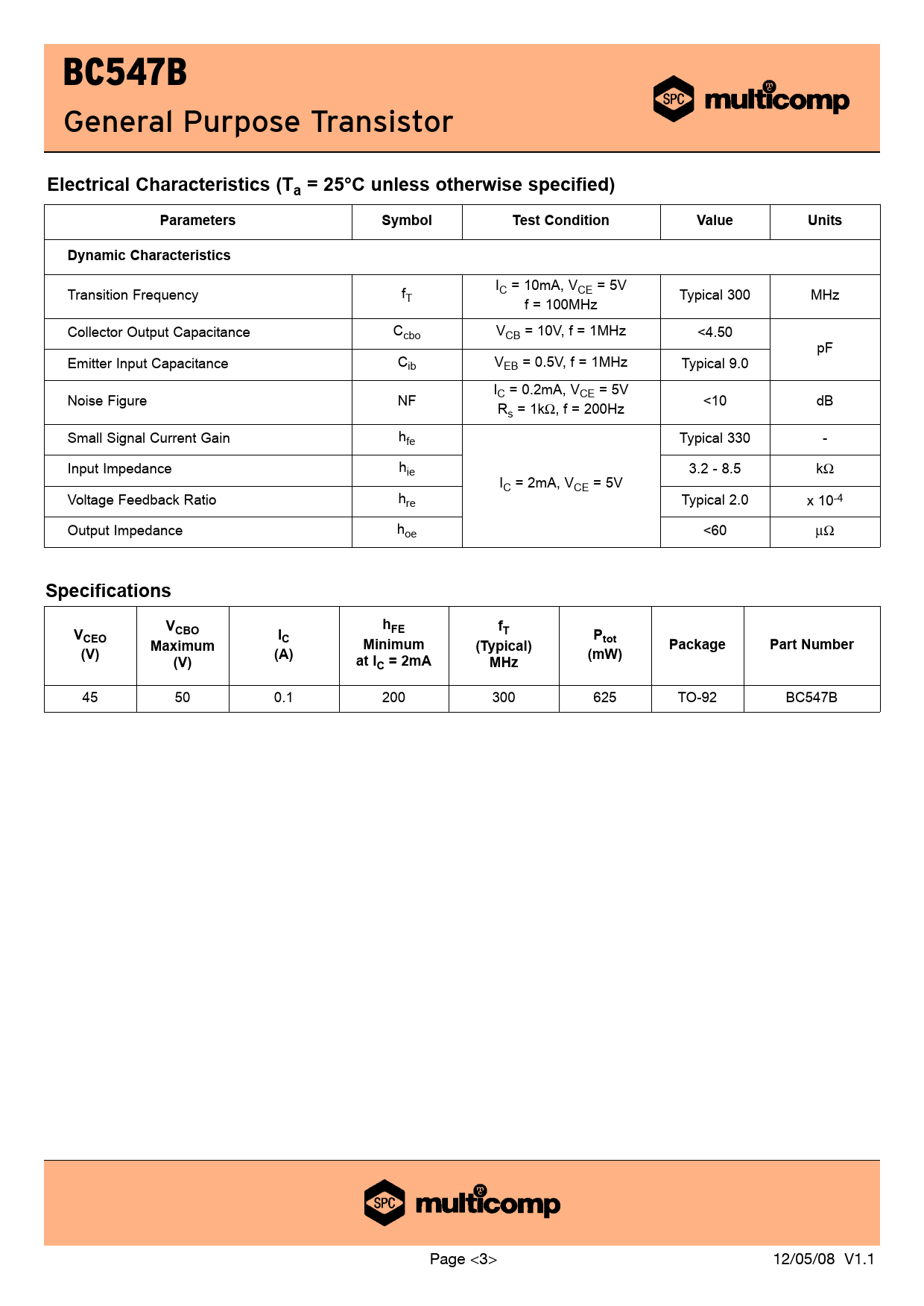 45 50 0.1 200 300 625 TO-92 BC547B Page <3> 12/05/08 V1.1