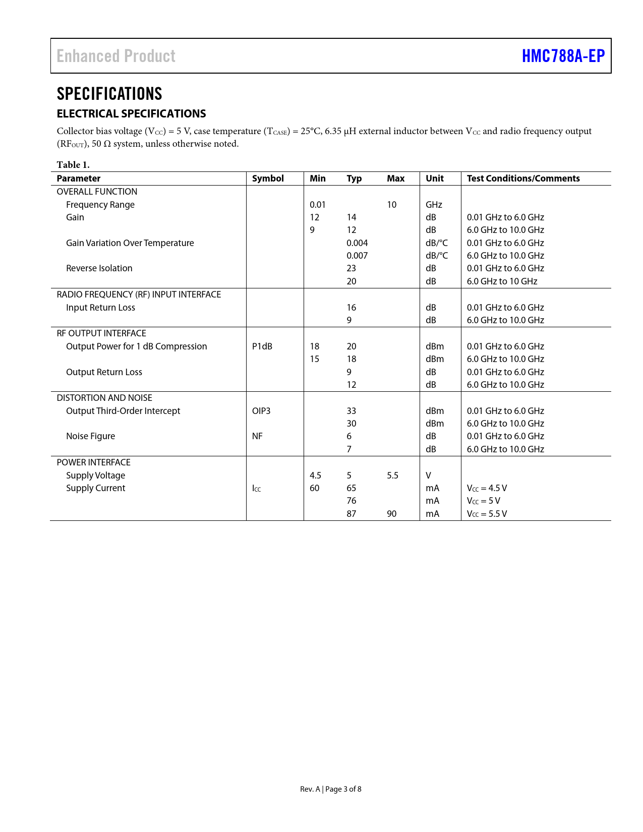 Enhanced Product. HMC788A-EP. SPECIFICATIONS ELECTRICAL SPECIFICATIONS. Table 1. Parameter. Symbol. Min. Typ. Max. Unit