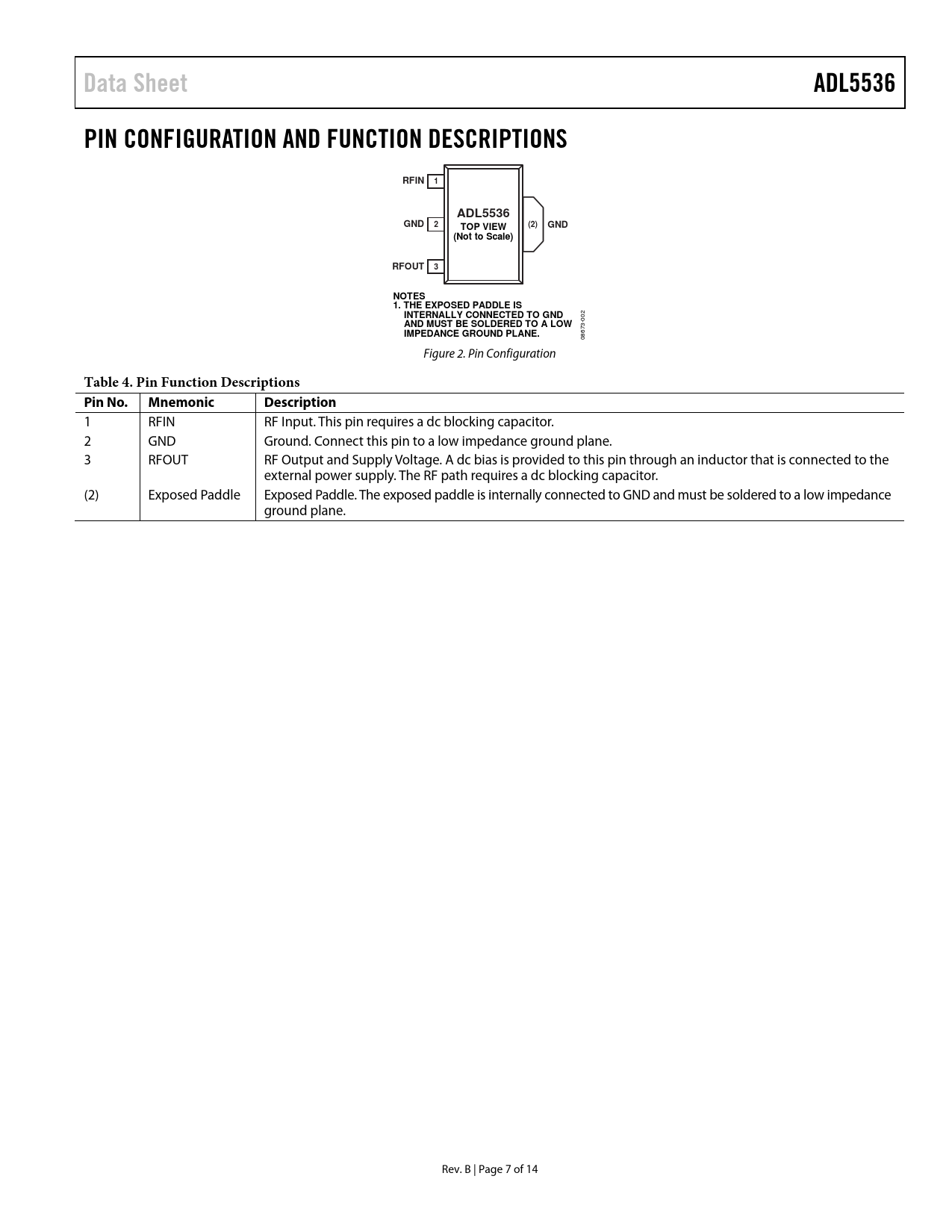 Data Sheet. ADL5536. PIN CONFIGURATION AND FUNCTION DESCRIPTIONS. RFIN. GND. (2). TOP VIEW. (Not to Scale). RFOUT