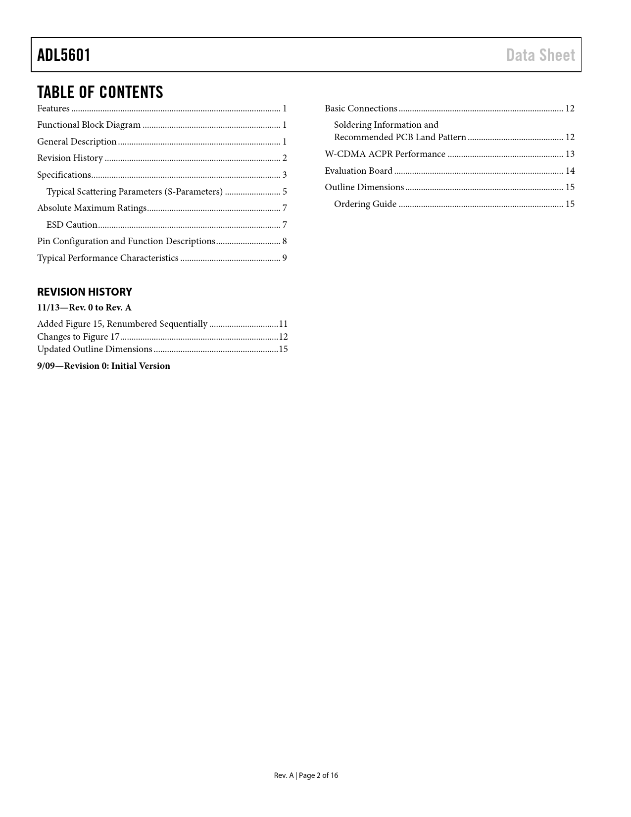 link to page 1 link to page 1 link to page 1 link to page 2 link to page 3 link to page 5 link to page 7 link to page 7 link to page 8 link to page 9 link to page 12 link to page 12 link to page 12 link to page 13 link to page 14 link to page 15 link to page 15 ADL5601Data SheetTABLE OF CONTENTS Features .. 1 Basic Connections .. 12 Functional Block Diagram .. 1 Soldering Information and General Description ... 1 Recommended PCB Land Pattern ... 12 Revision History ... 2 W-CDMA ACPR Performance .. 13 Specifications ... 3 Evaluation Board .. 14 Typical Scattering Parameters (S-Parameters) ... 5 Outline Dimensions ... 15 Absolute Maximum Ratings .. 7 Ordering Guide .. 15 ESD Caution .. 7 Pin Configuration and Function Descriptions ... 8 Typical Performance Characteristics ... 9 REVISION HISTORY 11/13—Rev. 0 to Rev. A Added Figure 15, Renumbered Sequentially ... 11 Changes to Figure 17 ... 12 Updated Outline Dimensions .. 15 9/09—Revision 0: Initial Version Rev. A | Page 2 of 16 Document Outline Features Functional Block Diagram General Description Revision History Specifications Typical Scattering Parameters (S-Parameters) Absolute Maximum Ratings ESD Caution Pin Configuration and Function Descriptions Typical Performance Characteristics Basic Connections Soldering Information and Recommended PCB Land Pattern W-CDMA ACPR Performance Evaluation Board Outline Dimensions Ordering Guide