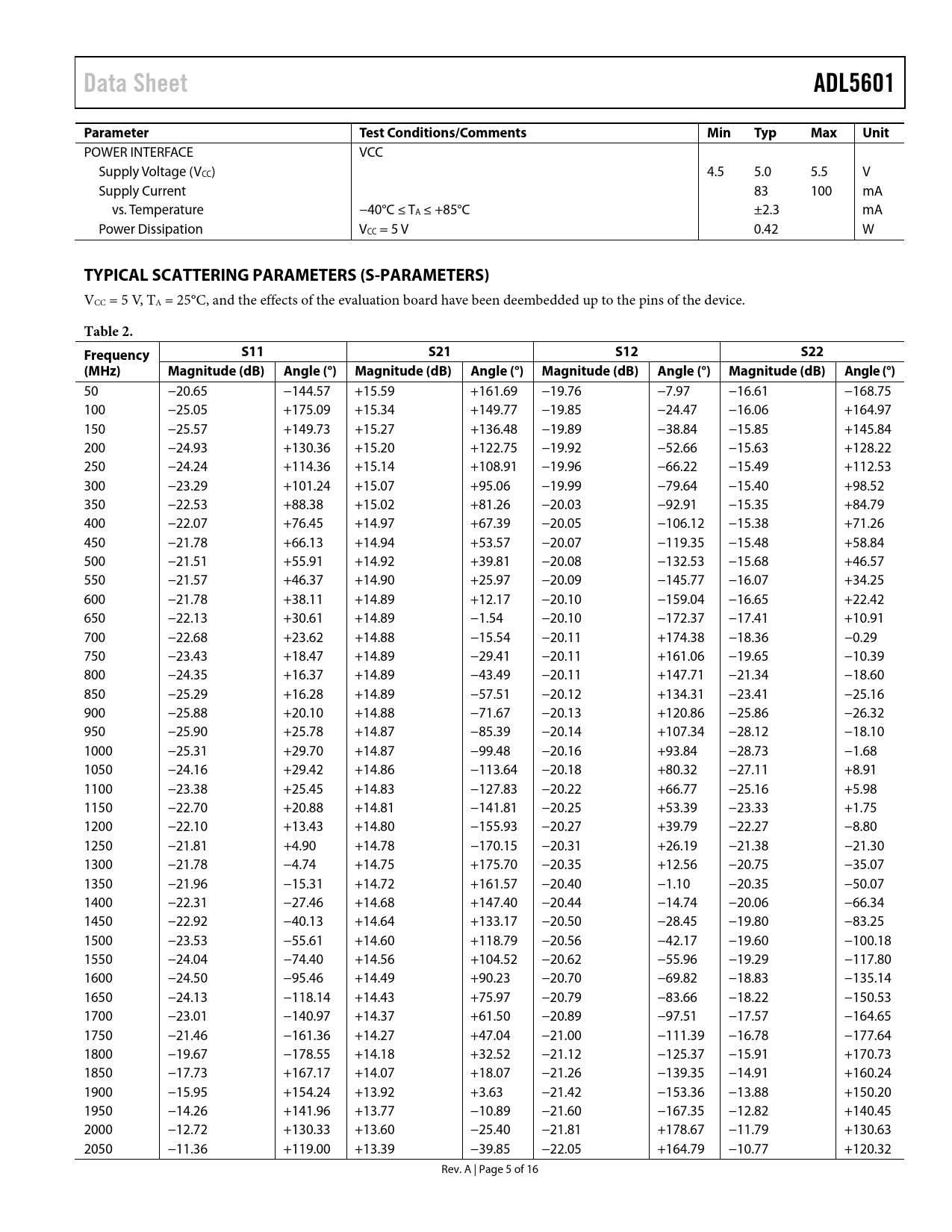 Data Sheet. ADL5601. Parameter. Test Conditions/Comments. Min. Typ. Max. Unit. TYPICAL SCATTERING PARAMETERS (S-PARAMETERS)