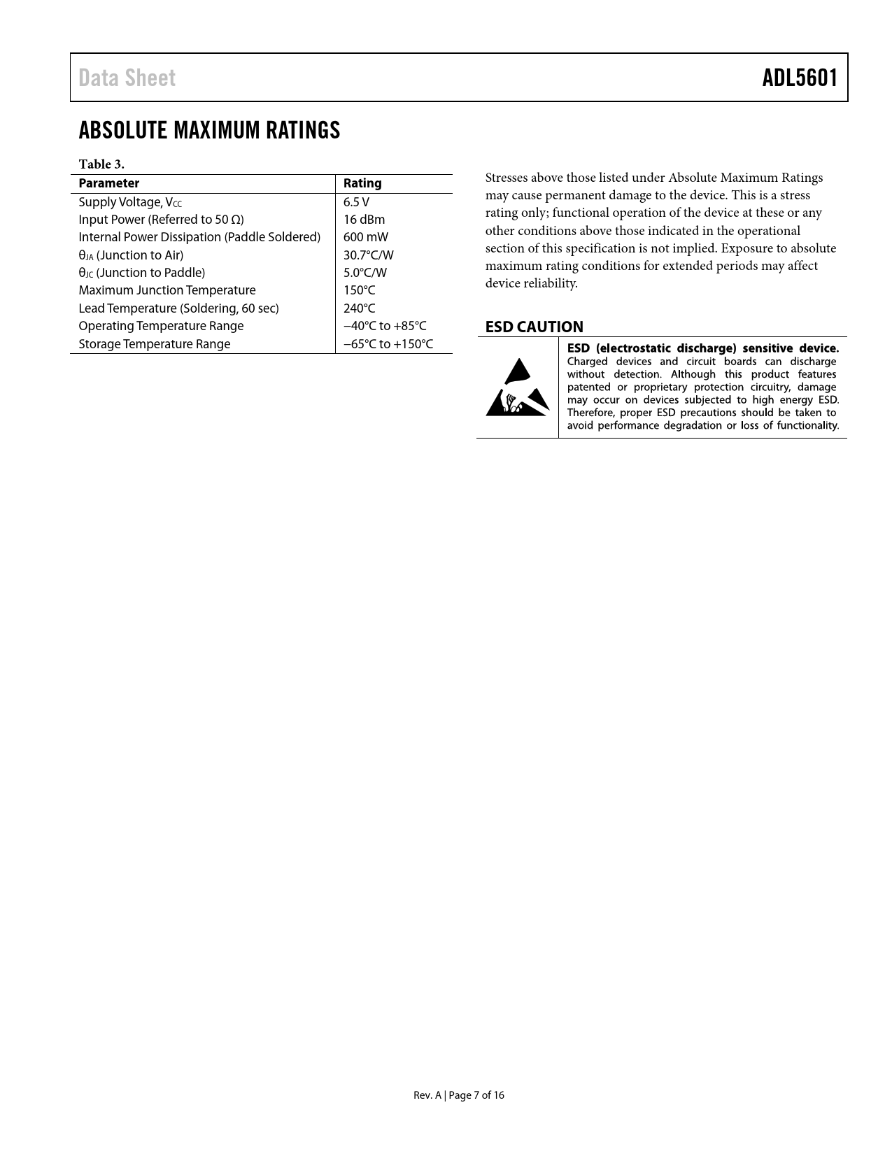 Data Sheet. ADL5601. ABSOLUTE MAXIMUM RATINGS. Table 3. Parameter. Rating. ESD CAUTION