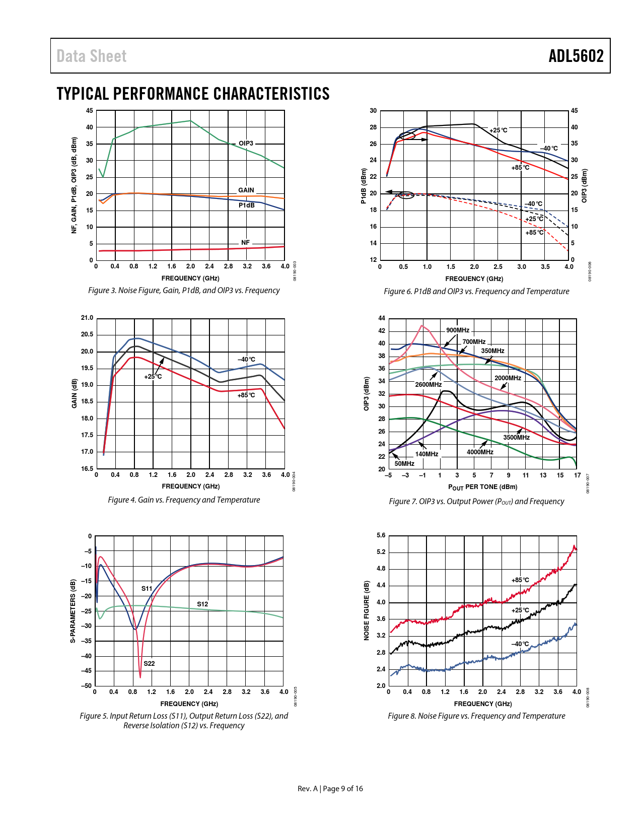 Data SheetADL5602TYPICAL PERFORMANCE CHARACTERISTICS453045402840+25°C) m35OIP3B2635–40°C, d B30d2430( 3)+85°C)mm25B 2225B, OIPd(d(B3dBGAIN20d 20201PP1OI, PP1dB–40°CIN151815A+25°C, G F101610N+85°C5NF1450120 3 6 00.40.81.21.62.02.42.83.23.64.0 00 00.51.01.52.02.53.03.54.0 00 0- 0- 19 19 FREQUENCY (GHz) 08 FREQUENCY (GHz) 08 Figure 3. Noise Figure, Gain, P1dB, and OIP3 vs. Frequency Figure 6. P1dB and OIP3 vs. Frequency and Temperature 21.04442900MHz20.540700MHz20.0350MHz38–40°C19.536)+25°C)2000MHzB3419.0mdB2600MHz(d (32IN+85°C318.5GA30OIP18.0282617.53500MHz2417.04000MHz22140MHz50MHz16.52000.40.81.21.62.02.42.83.23.64.0 400 –5–3–11357911131517 07 0- -0 FREQUENCY (GHz) 19 P 90 08 OUT PER TONE (dBm) 81 0 Figure 4. Gain vs. Frequency and Temperature Figure 7. OIP3 vs. Output Power (POUT) and Frequency 05.6–55.2–104.8–15+85°CB) dB)4.4(S11d (–20RSEES124.0TUR–25E+25°CIG F3.6AME–30ARIS-P3.2S–35NO–40°C2.8–40S22–452.4–502.0 8 00.40.81.21.62.02.42.83.23.64.0 05 0 00.40.81.21.62.02.42.83.23.64.0 00 0- 0- 19 FREQUENCY (GHz) 19 08 FREQUENCY (GHz) 08 Figure 5. Input Return Loss (S11), Output Return Loss (S22), and Figure 8. Noise Figure vs. Frequency and Temperature Reverse Isolation (S12) vs. Frequency Rev. A | Page 9 of 16 Document Outline Features Functional Block Diagram General Description Revision History Specifications Typical Scattering Parameters (S Parameters) Absolute Maximum Ratings ESD Caution Pin Configuration and Function Descriptions Typical Performance Characteristics Basic Connections Soldering Information and Recommended PCB Land Pattern W-CDMA ACPR Performance Evaluation Board Outline Dimensions Ordering Guide