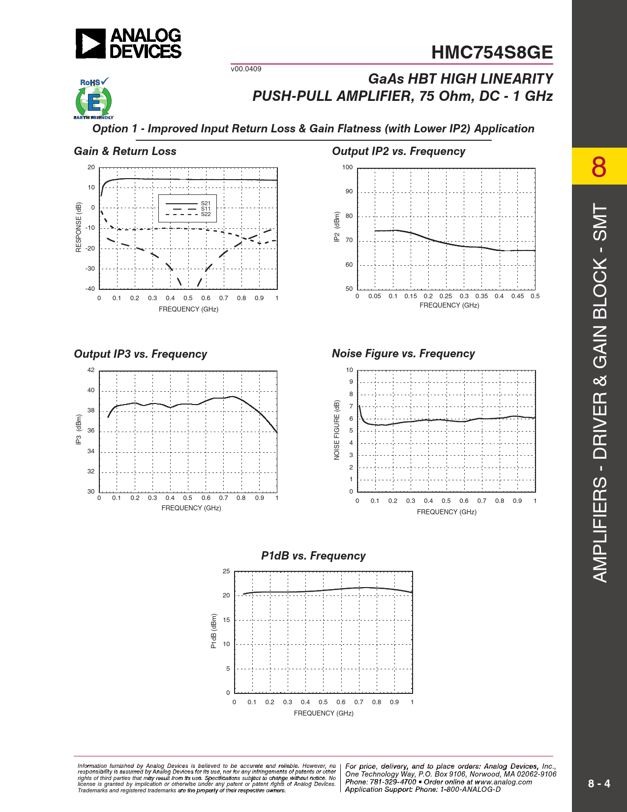 HMC754S8GE v00.0409 GaAs HBT HIGH LINEARITYPUSH-PULL AMPLIFIER, 75 Ohm, DC - 1 GHzOption 1 - Improved Input Return Loss & Gain Flatness (with Lower IP2) ApplicationGain & Return LossOutput IP2 vs. Frequency 20 100 8 10 90 ) S21 0 S11 (dB S22 ) m 80 T E S N -10 m O P 2 (dB S IP 70 s E -20 R 60 -30 k - c -40 50 0 0.1 0.2 0.3 0.4 0.5 0.6 0.7 0.8 0.9 1 0 0.05 0.1 0.15 0.2 0.25 0.3 0.35 0.4 0.45 0.5 FREQUENCY (GHz) lo FREQUENCY (GHz) in B Output IP3 vs. FrequencyNoise Figure vs. Frequency A 42 10 9 40 8 ) 7 r & G 38 ) (dB E 6 e m R U 36 5 IG iv 3 (dB F IP E 4 IS r 34 O 3 N 2 32 1 s - D 30 0 0 0.1 0.2 0.3 0.4 0.5 0.6 0.7 0.8 0.9 1 0 0.1 0.2 0.3 0.4 0.5 0.6 0.7 0.8 0.9 1 r FREQUENCY (GHz) FREQUENCY (GHz) ie lif P1dB vs. Frequency p 25 m A 20 15 (dBm) 10 P1dB 5 0 0 0.1 0.2 0.3 0.4 0.5 0.6 0.7 0.8 0.9 1 FREQUENCY (GHz) Inf F or o m rat ip o r n ifc ur e n ,is hd e e d lbiv y e Anry alo a g n D d evi cto es ips la beclie ev eo d rtd o e b r e sa: ccH ur iattte itaen M d reliic a r bl o e w . H a o v weev eC r, o n r o For price, delivery, and to place orders: Analog Devices, Inc., responsibility is assumed by Analog Devices for its use, nor for any infringements of patents or other poration, 20 Alpha Road, Chelmsford, MA 01824 One Technology Way, P.O. Box 9106, Norwood, MA 02062-9106 Phone: 978-250-3343 Fax: 978-250-3373 rights of third parties that may result from its use. Specifications subject to change without notice. No Or P d hoe n r e O : 7 n- 81-li 3 n 2 e 9- a 4 t 7 0 www 0 • O . rdh e itt r o it n e li . n co e a m license is granted by implication or otherwise under any patent or patent rights of Analog Devices. t www.analog.com 8 - 4 Application Support: Phon Trademarks and registered trademarks are the property of their respective owners. e: 978-250-334 A 3 p p liocra t ia o pp n S s u @ p h por ittti : Pte. ho c n o e m : 1-800-ANALOG-D