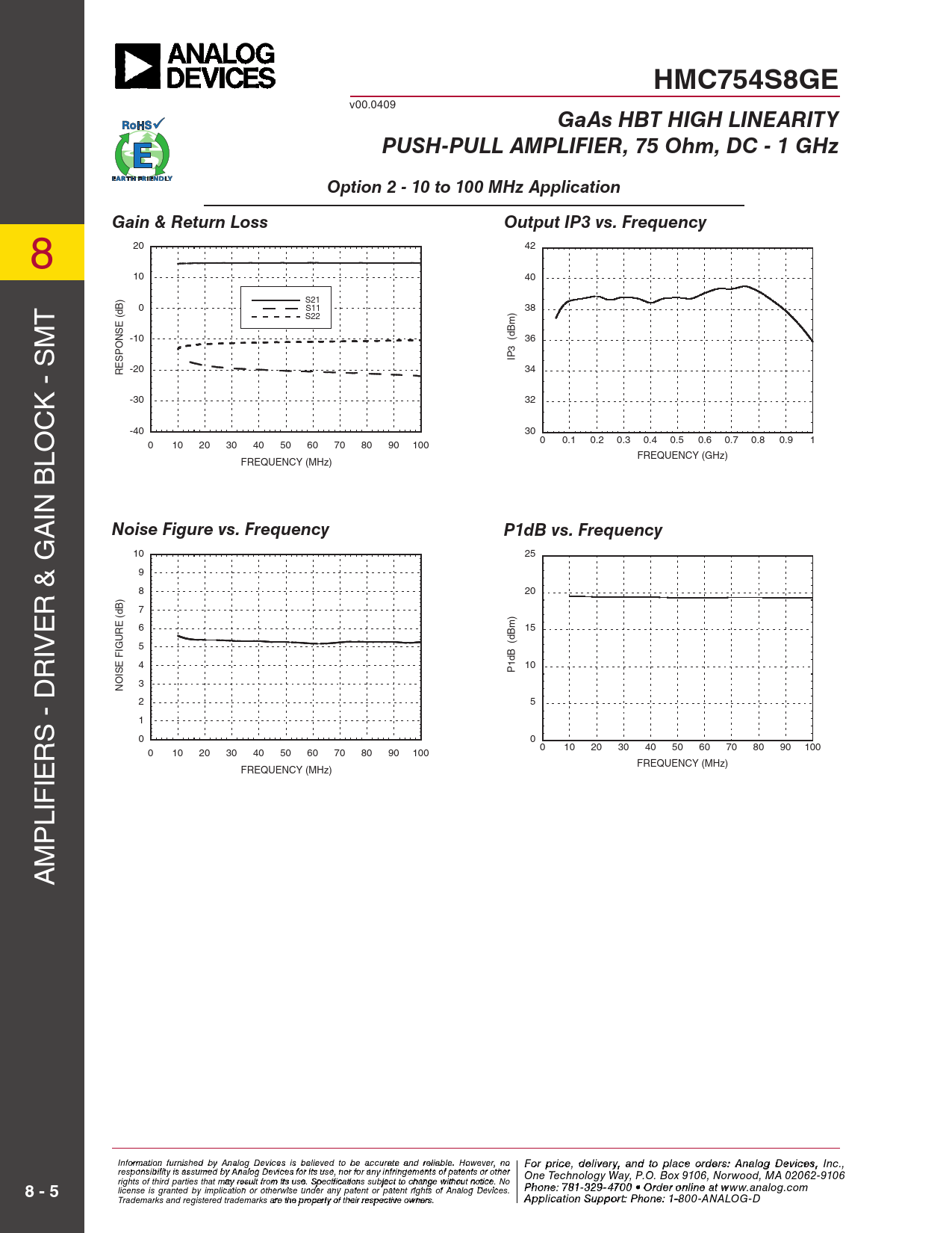 HMC754S8GE. GaAs HBT HIGH LINEARITY. PUSH-PULL AMPLIFIER, 75 Ohm, DC - 1 GHz. Option 2 - 10 to 100 MHz Application