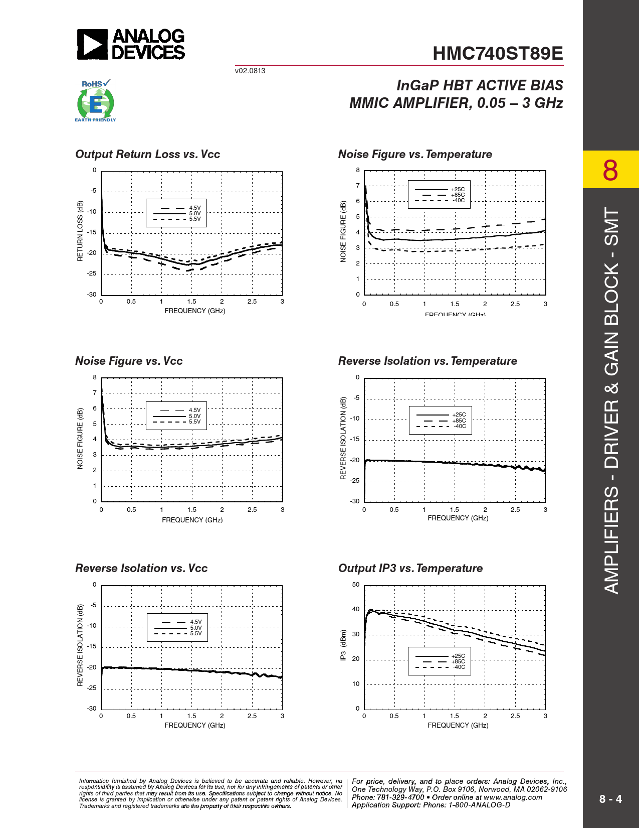 HMC740ST89E. InGaP HBT ACTIVE BIAS. MMIC AMPLIFIER, 0.05 – 3 GHz. Output Return Loss vs. Vcc. Noise Figure vs. Temperature