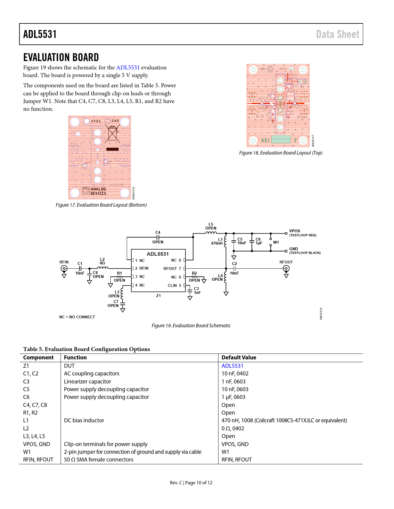 link to page 10 link to page 10 ADL5531Data SheetEVALUATION BOARD Figure 19 shows the schematic for the ADL5531 evaluation board. The board is powered by a single 5 V supply. The components used on the board are listed in Table 5. Power can be applied to the board through clip-on leads or through Jumper W1. Note that C4, C7, C8, L3, L4, L5, R1, and R2 have no function. 017 06833- Figure 18. Evaluation Board Layout (Top) 016 06833- Figure 17. Evaluation Board Layout (Bottom) L5OPENC4VPOS(TESTLOOP RED)L1C5C6OPEN470nH10nF1µFW1GNDADL5531(TESTLOOP BLACK)L21 NCNC 8RFIN0ΩRFOUTC1C22 RFINRFOUT 710nFC8R1R2OPENL410nF3 NCNC 6OPENOPENOPEN4 NCCLIN 5C3L31nFOPENZ1C7OPEN 018 NC = NO CONNECT 06833- Figure 19. Evaluation Board Schematic Table 5. Evaluation Board Configuration Options ComponentFunctionDefault Value Z1 DUT ADL5531 C1, C2 AC coupling capacitors 10 nF, 0402 C3 Linearizer capacitor 1 nF, 0603 C5 Power supply decoupling capacitor 10 nF, 0603 C6 Power supply decoupling capacitor 1 µF, 0603 C4, C7, C8 Open R1, R2 Open L1 DC bias inductor 470 nH, 1008 (Coilcraft 1008CS-471XJLC or equivalent) L2 0 Ω, 0402 L3, L4, L5 Open VPOS, GND Clip-on terminals for power supply VPOS, GND W1 2-pin jumper for connection of ground and supply via cable W1 RFIN, RFOUT 50 Ω SMA female connectors RFIN, RFOUT Rev. C | Page 10 of 12 Document Outline FEATURES FUNCTIONAL BLOCK DIAGRAM GENERAL DESCRIPTION REVISION HISTORY SPECIFICATIONS TYPICAL SCATTERING PARAMETERS ABSOLUTE MAXIMUM RATINGS ESD CAUTION PIN CONFIGURATION AND FUNCTION DESCRIPTIONS TYPICAL PERFORMANCE CHARACTERISTICS BASIC CONNECTIONS SOLDERING INFORMATION AND RECOMMENDED PCB LAND PATTERN EVALUATION BOARD OUTLINE DIMENSIONS ORDERING GUIDE