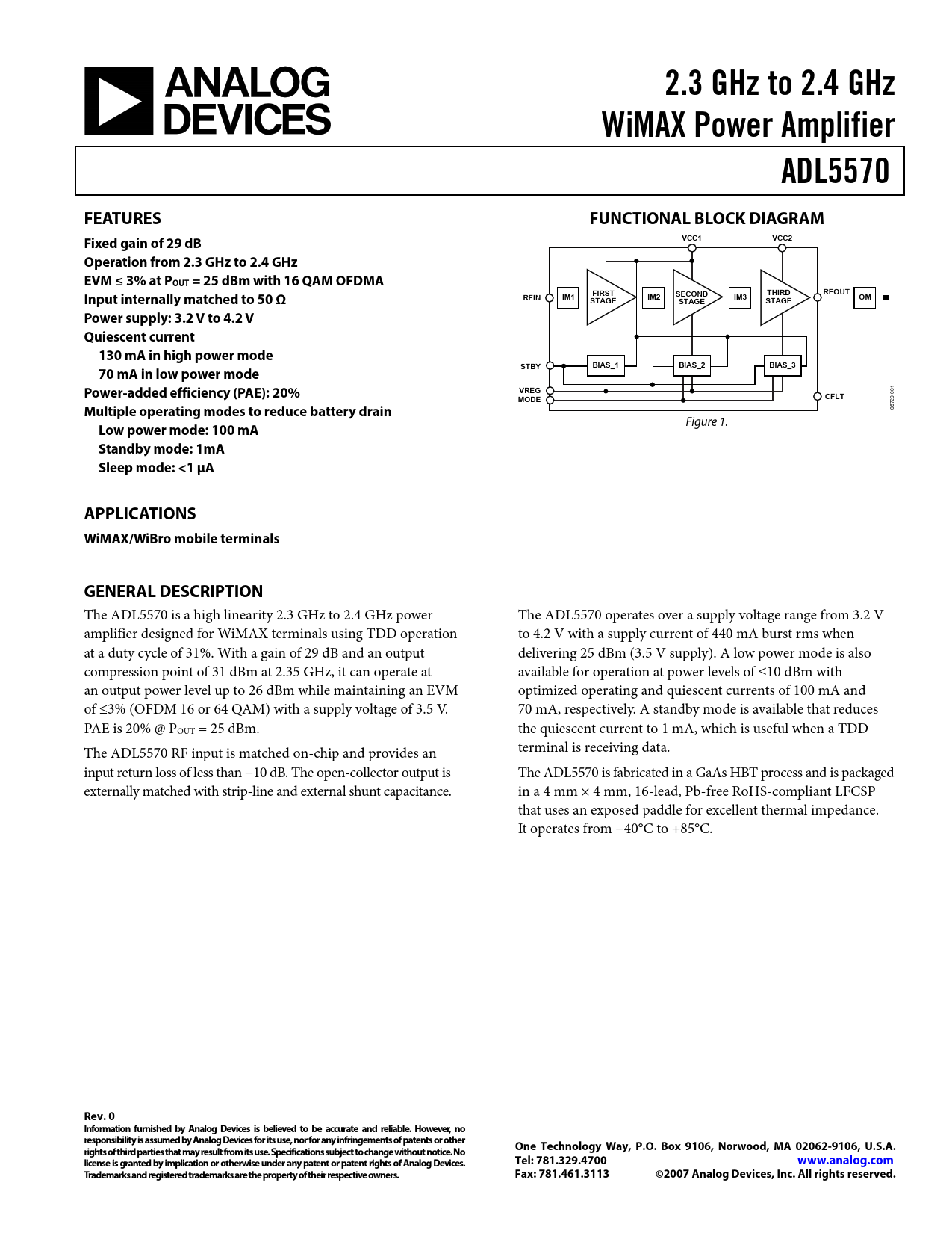 2.3 GHz to 2.4 GHz. WiMAX Power Amplifier. ADL5570. FEATURES. FUNCTIONAL BLOCK DIAGRAM. VCC1. VCC2