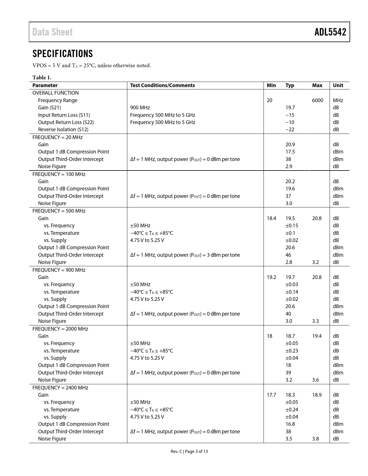 Data SheetADL5542SPECIFICATIONS VPOS = 5 V and TA = 25°C, unless otherwise noted. Table 1. ParameterTest Conditions/CommentsMinTypMaxUnit OVERALL FUNCTION Frequency Range 20 6000 MHz Gain (S21) 900 MHz 19.7 dB Input Return Loss (S11) Frequency 500 MHz to 5 GHz −15 dB Output Return Loss (S22) Frequency 500 MHz to 5 GHz −10 dB Reverse Isolation (S12) −22 dB FREQUENCY = 20 MHz Gain 20.9 dB Output 1 dB Compression Point 17.5 dBm Output Third-Order Intercept Δf = 1 MHz, output power (POUT) = 0 dBm per tone 38 dBm Noise Figure 2.9 dB FREQUENCY = 100 MHz Gain 20.2 dB Output 1 dB Compression Point 19.6 dBm Output Third-Order Intercept Δf = 1 MHz, output power (POUT) = 0 dBm per tone 37 dBm Noise Figure 3.0 dB FREQUENCY = 500 MHz Gain 18.4 19.5 20.8 dB vs. Frequency ±50 MHz ±0.15 dB vs. Temperature −40°C ≤ TA ≤ +85°C ±0.1 dB vs. Supply 4.75 V to 5.25 V ±0.02 dB Output 1 dB Compression Point 20.6 dBm Output Third-Order Intercept Δf = 1 MHz, output power (POUT) = 3 dBm per tone 46 dBm Noise Figure 2.8 3.2 dB FREQUENCY = 900 MHz Gain 19.2 19.7 20.8 dB vs. Frequency ±50 MHz ±0.03 dB vs. Temperature −40°C ≤ TA ≤ +85°C ±0.14 dB vs. Supply 4.75 V to 5.25 V ±0.02 dB Output 1 dB Compression Point 20.6 dBm Output Third-Order Intercept Δf = 1 MHz, output power (POUT) = 0 dBm per tone 40 dBm Noise Figure 3.0 3.3 dB FREQUENCY = 2000 MHz Gain 18 18.7 19.4 dB vs. Frequency ±50 MHz ±0.05 dB vs. Temperature −40°C ≤ TA ≤ +85°C ±0.23 dB vs. Supply 4.75 V to 5.25 V ±0.04 dB Output 1 dB Compression Point 18 dBm Output Third-Order Intercept Δf = 1 MHz, output power (POUT) = 0 dBm per tone 39 dBm Noise Figure 3.2 3.6 dB FREQUENCY = 2400 MHz Gain 17.7 18.3 18.9 dB vs. Frequency ±50 MHz ±0.05 dB vs. Temperature −40°C ≤ TA ≤ +85°C ±0.24 dB vs. Supply 4.75 V to 5.25 V ±0.04 dB Output 1 dB Compression Point 16.8 dBm Output Third-Order Intercept Δf = 1 MHz, output power (POUT) = 0 dBm per tone 38 dBm Noise Figure 3.5 3.8 dB Rev. C | Page 3 of 13 Document Outline FEATURES FUNCTIONAL BLOCK DIAGRAM GENERAL DESCRIPTION TABLE OF CONTENTS REVISION HISTORY SPECIFICATIONS TYPICAL SCATTERING PARAMETERS ABSOLUTE MAXIMUM RATINGS ESD CAUTION PIN CONFIGURATION AND FUNCTION DESCRIPTIONS TYPICAL PERFORMANCE CHARACTERISTICS OPERATING TO 20 MHz BASIC CONNECTIONS SOLDERING INFORMATION AND RECOMMENDED PCB LAND PATTERN EVALUATION BOARD OUTLINE DIMENSIONS ORDERING GUIDE