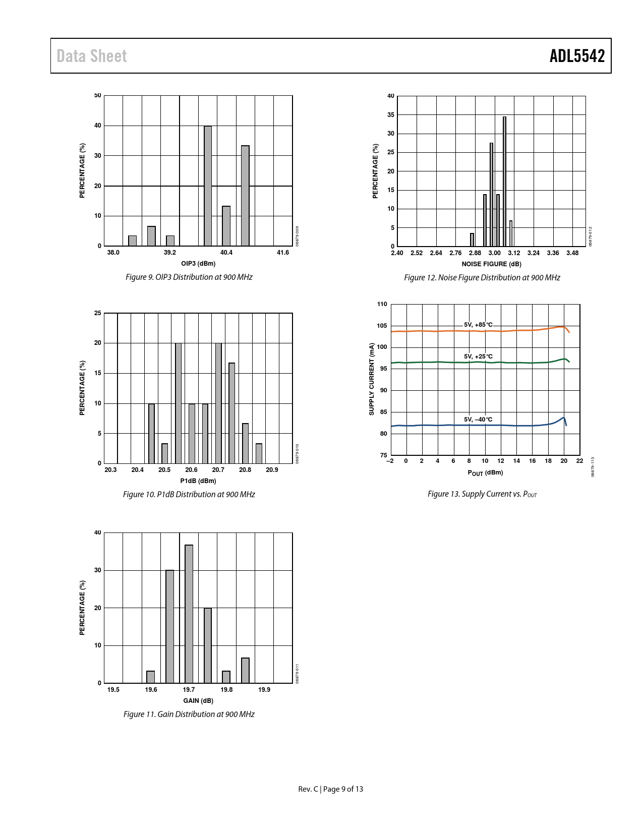 Figure 10. P1dB Distribution at 900 MHz Figure 13. Supply Current vs. POUT