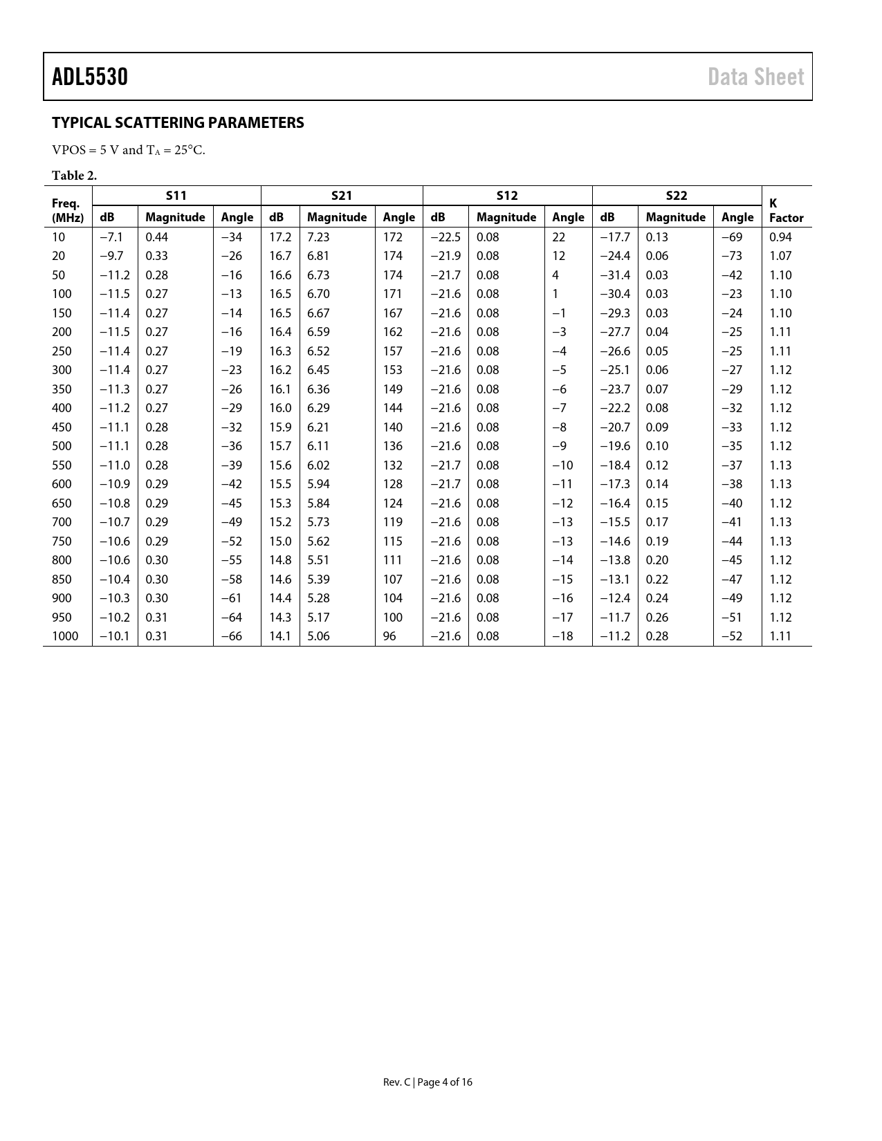 | Pages / Page | 16 / 4 — ADL5530. Data Sheet. TYPICAL SCATTERING PARAMETERS. Table 2. S11. S21. … |